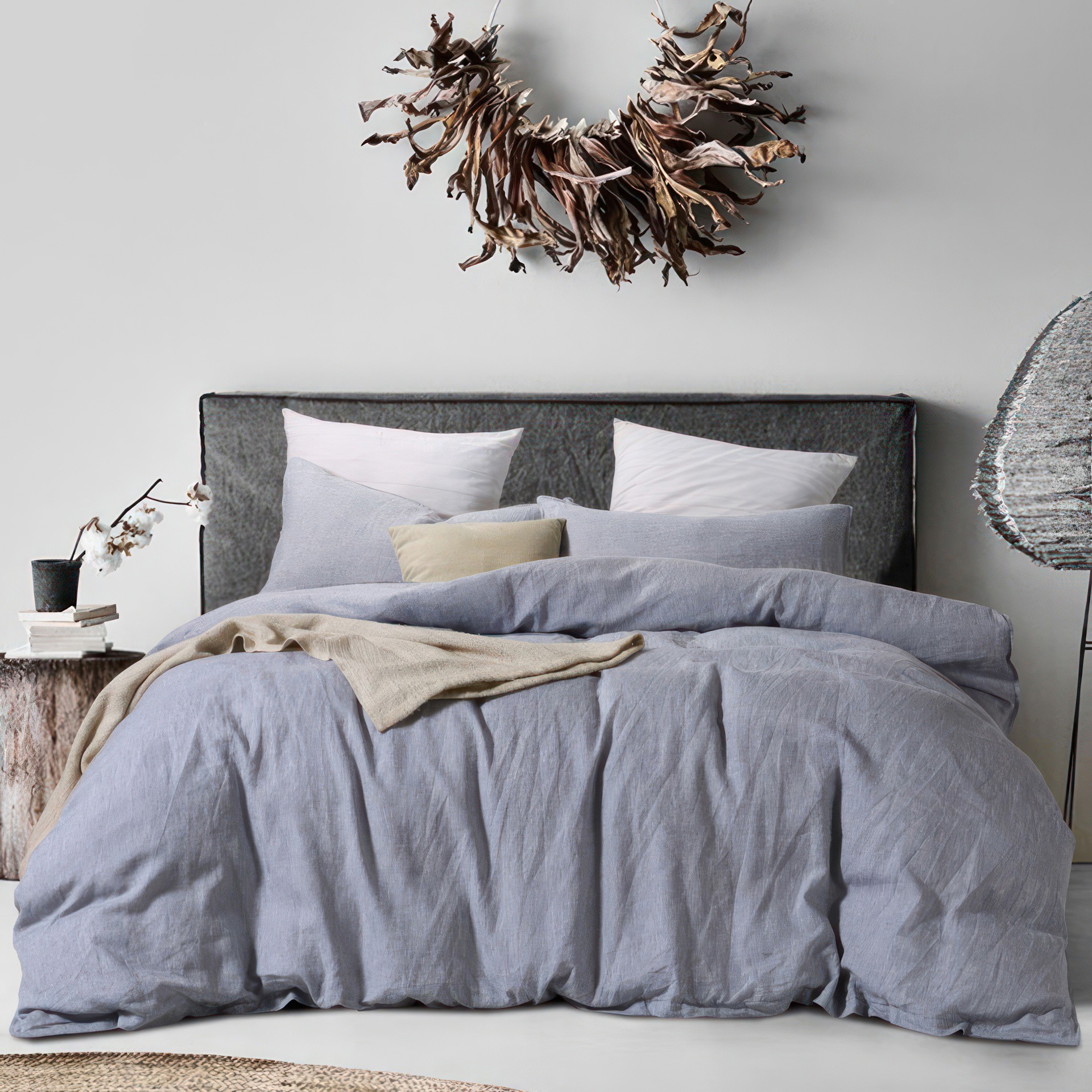 L'ensemble de housse de couette en lin français Blue Heather est teint dans une teinte parfaite de denim ajoutant de la couleur et de l'élégance à votre chambre. Notre lin, originaire de France, est prélavé, ce qui le rend extra doux et vous donne cet aspect naturel "vécu".