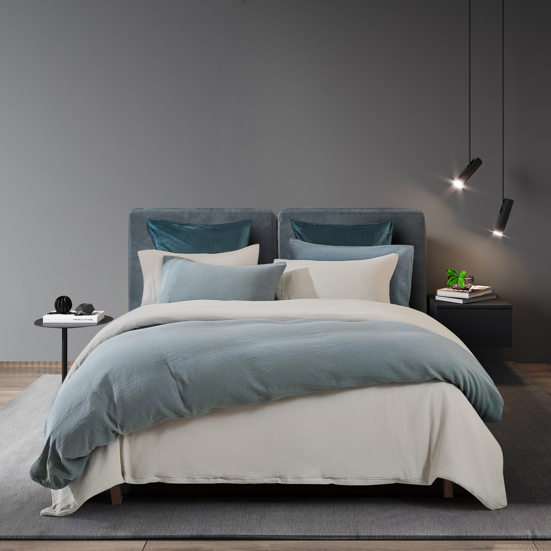 L'ensemble housse de couette et 2 taies d'oreillers froissée est un ajout élégant à la décoration de votre chambre. Dusk, un gris bleu doux, est une couleur polyvalente qui est souvent utilisée pour évoquer une atmosphère onirique et romantique.