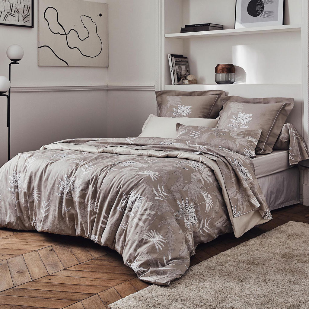 Ensemble de housse de couette et caches oreillers en satin de coton de 275 fils au pouce. L´impression au coeur de la fibre donne une haute tenue des couleurs, et le traitement « honey touch » confère un toucher incroyablement souple au tissu.