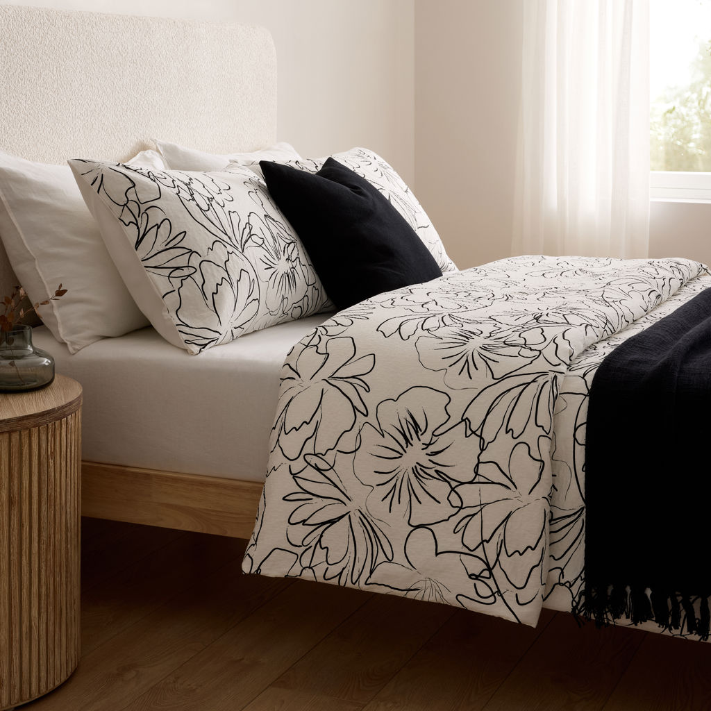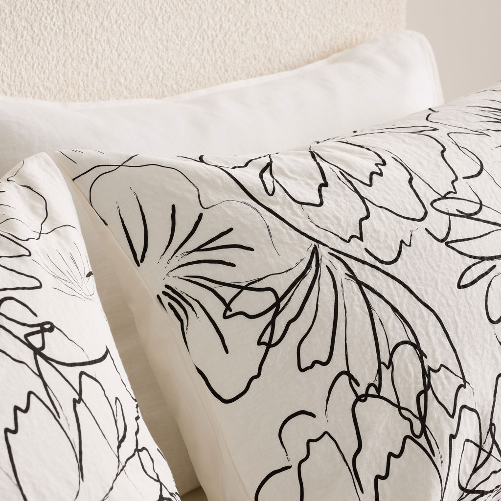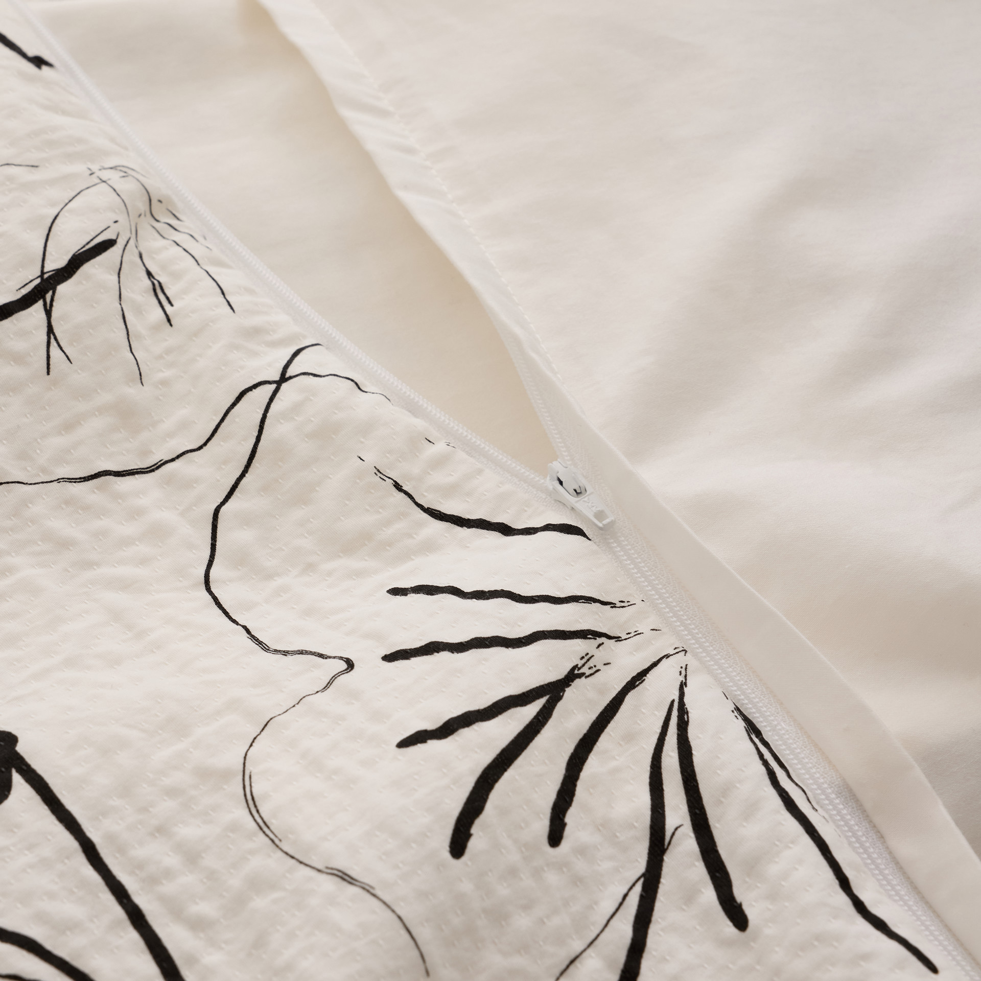 L'ensemble de housse de couette Noah présente un imprimé botanique noir sur blanc, offrant une esthétique contemporaine et chic.
