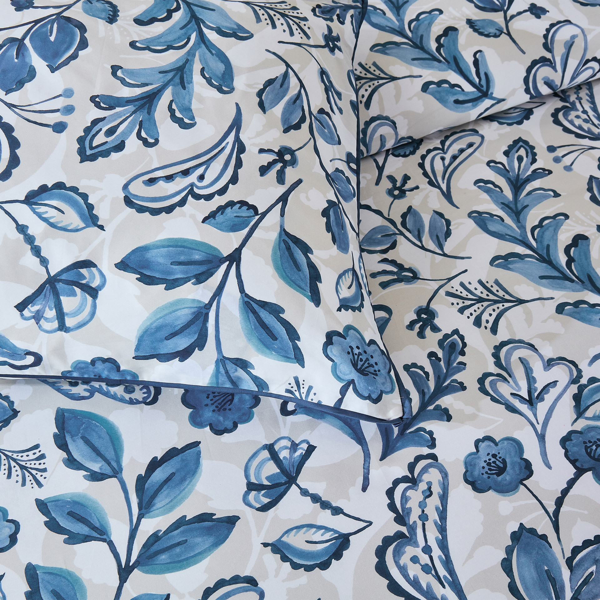 L'ensemble housse de couette et taies d'oreiller Canopy marie des éléments modernes de feuillage et de fleurs dans de douces teintes aquarellées de bleu, sur un fond blanc apaisant.