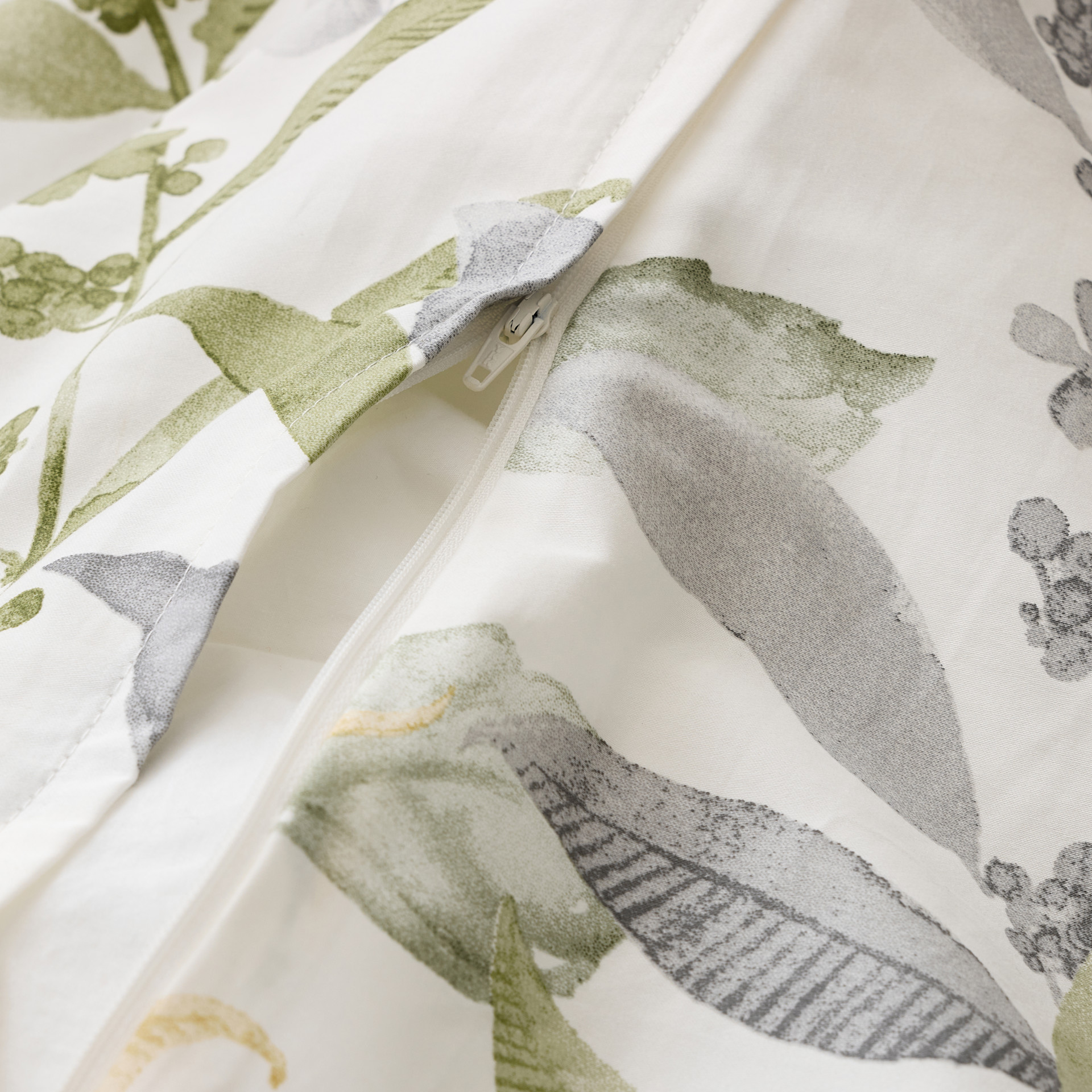 Aspen est un ensemble housse de couette et 2 taies d'oreillers inspiré de la nature avec d'élégantes feuilles vertes, dorées et grises qui s'enroulent sur un fond blanc chaud créant une ambiance calme et élégante.