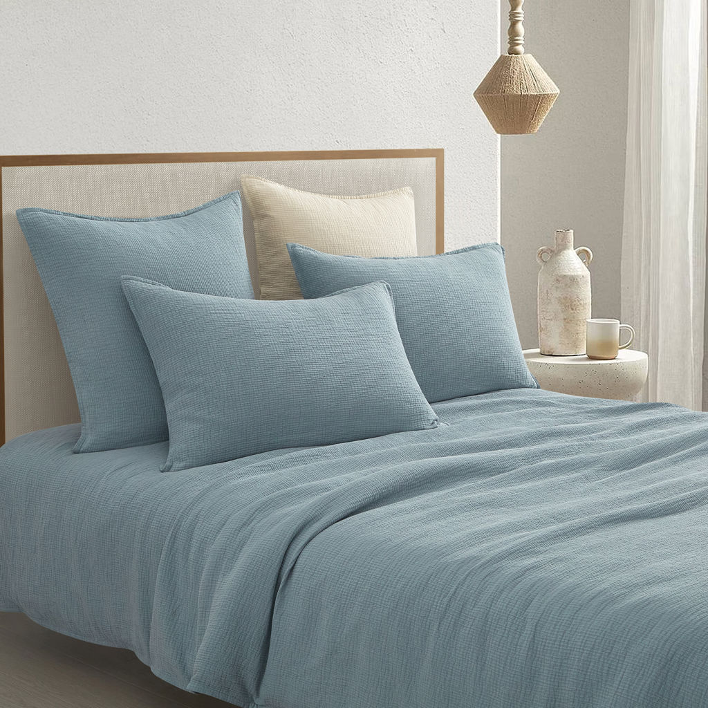 Fabriqué en 100 % coton, le devant présente une texture matelassée prélavée, tandis que l'envers est fabriqué en percale de coton lavé 200 fils au pouce carré, offrant un toucher doux et une bonne respirabilité.