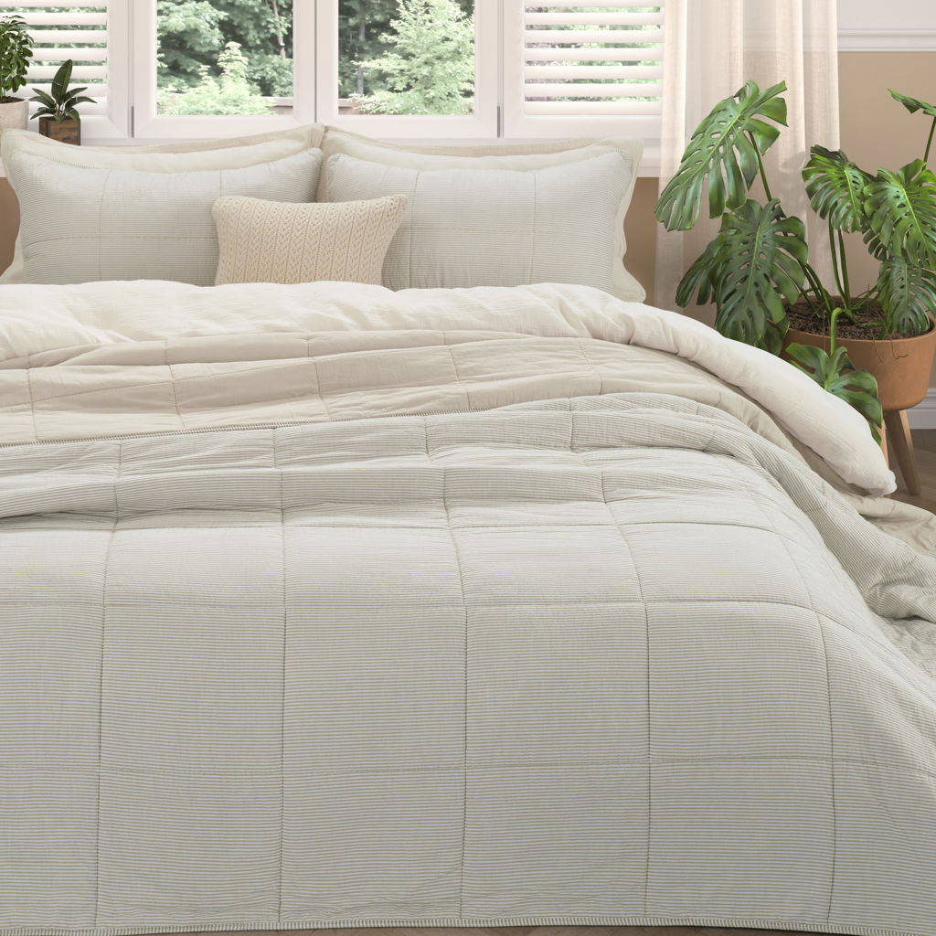 Ensemble de courtepointe réversible rayée naturel et ivoire. Revers uni naturel.