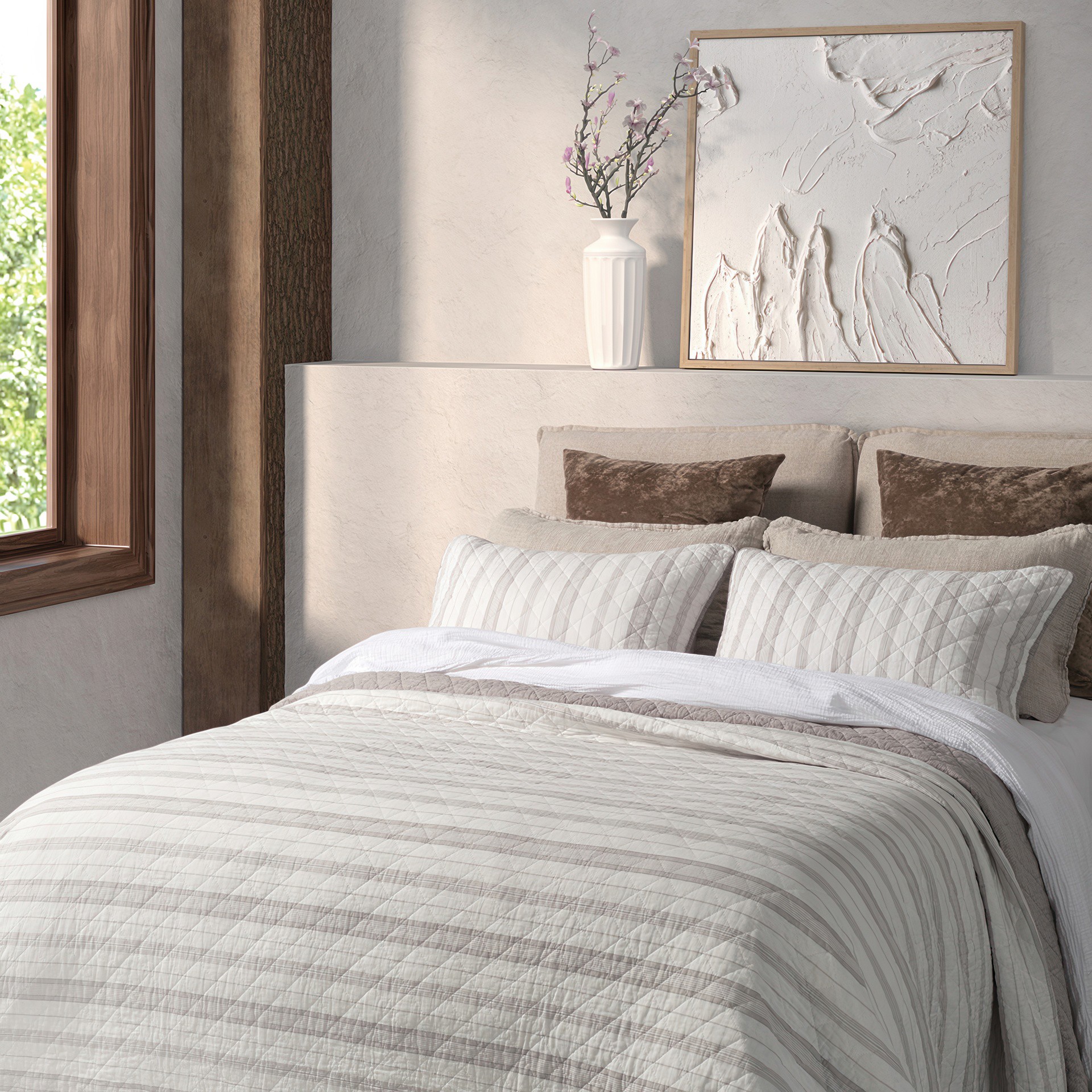 Courtepointe imprimée à rayures dans les teintes de taupe et de gris sur un fond ivoire.