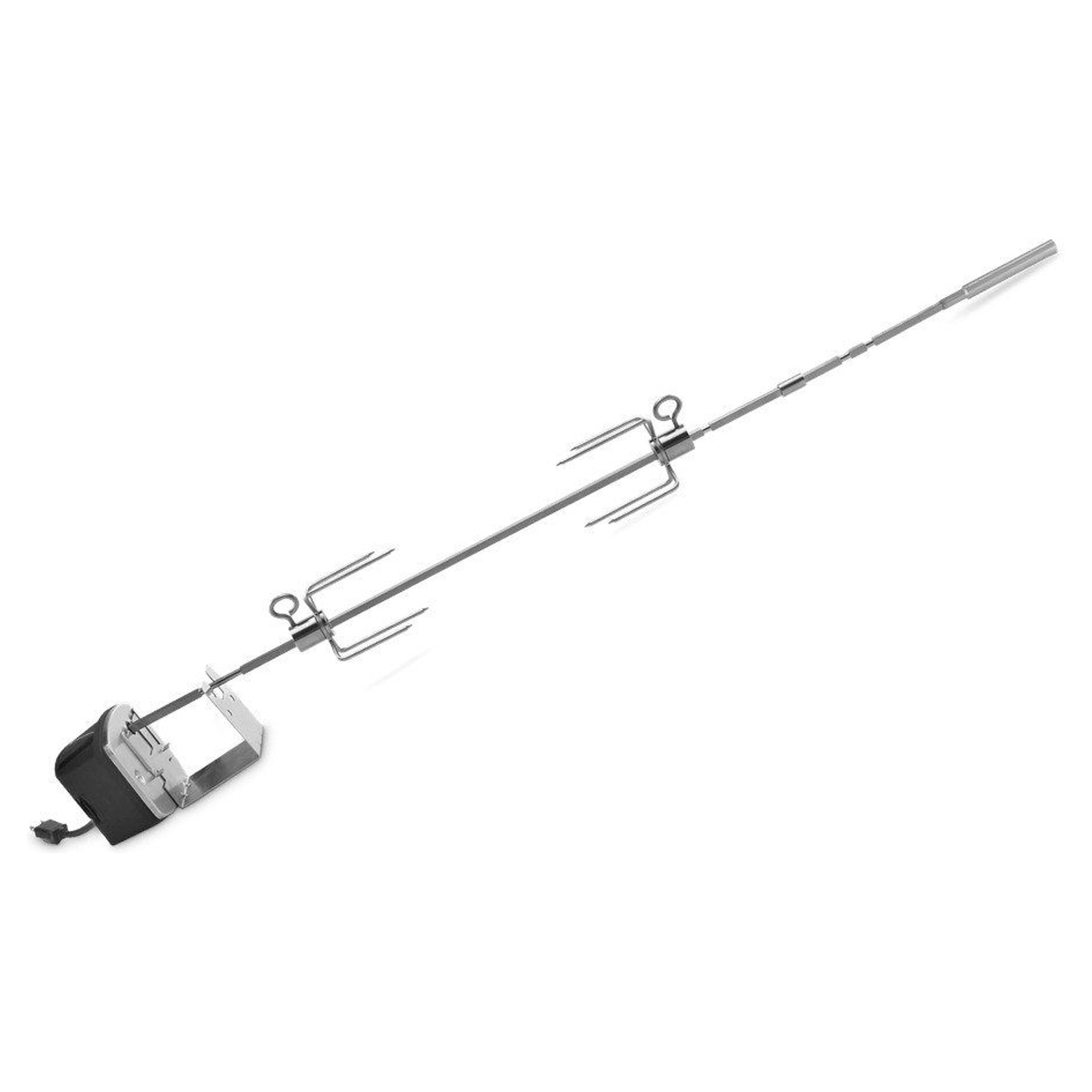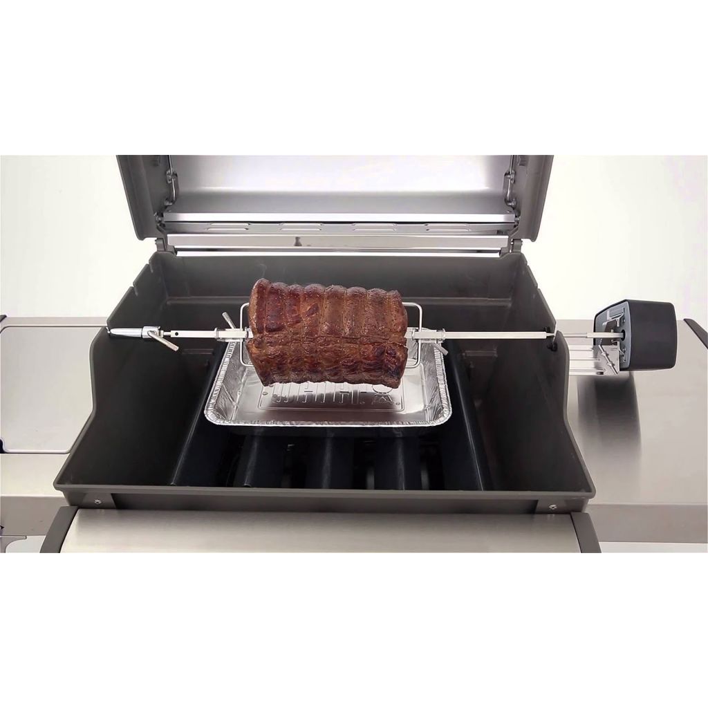 Transformez votre barbecue en rôtissoire extérieure. Faites rôtir lentement un poulet à la fois croustillant et juteux et des côtes levées tendres. La rôtissoire fait lentement tourner les aliments au-dessus de la grille de cuisson, vous procurant ainsi une viande succulente, et savoureuse tout droit sortie de votre arrière-cour.