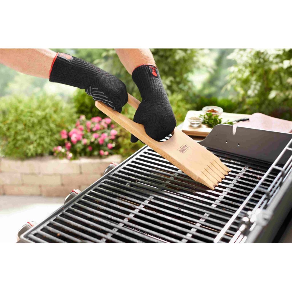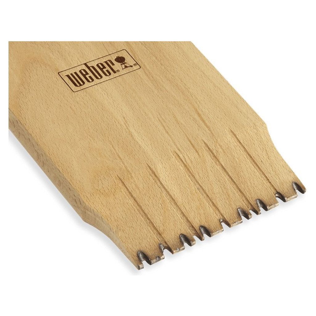 Ce grattoir en bois est un moyen naturel sans filaments de nettoyer les grilles de cuisson d'un barbecue. Grâce à sa prise spécialement conçue et aux coches qui adoptent le profil de la grille, il enlève efficacement les résidus collés aux tiges de la grille.