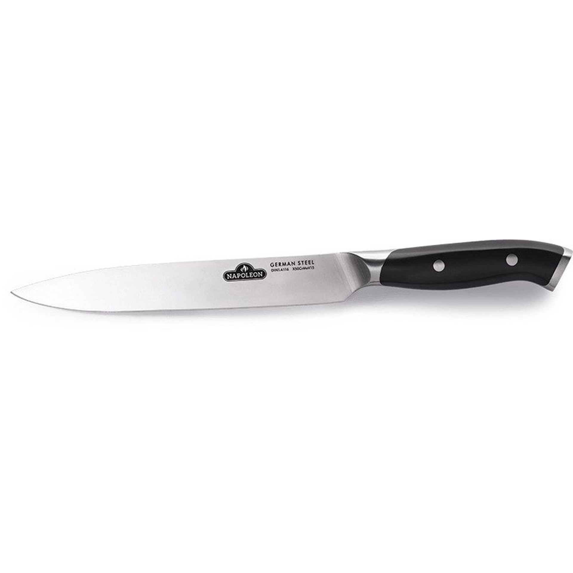 Le couteau à découper de 8 pouces de Napoléon est un bel ajout à votre bloc de couteaux. L'acier inoxydable forgé court sur toute la longueur du couteau; le Il est équilibré de la pointe, tout au long de la soie. La double poignée rivetée offre un confort ergonomique.