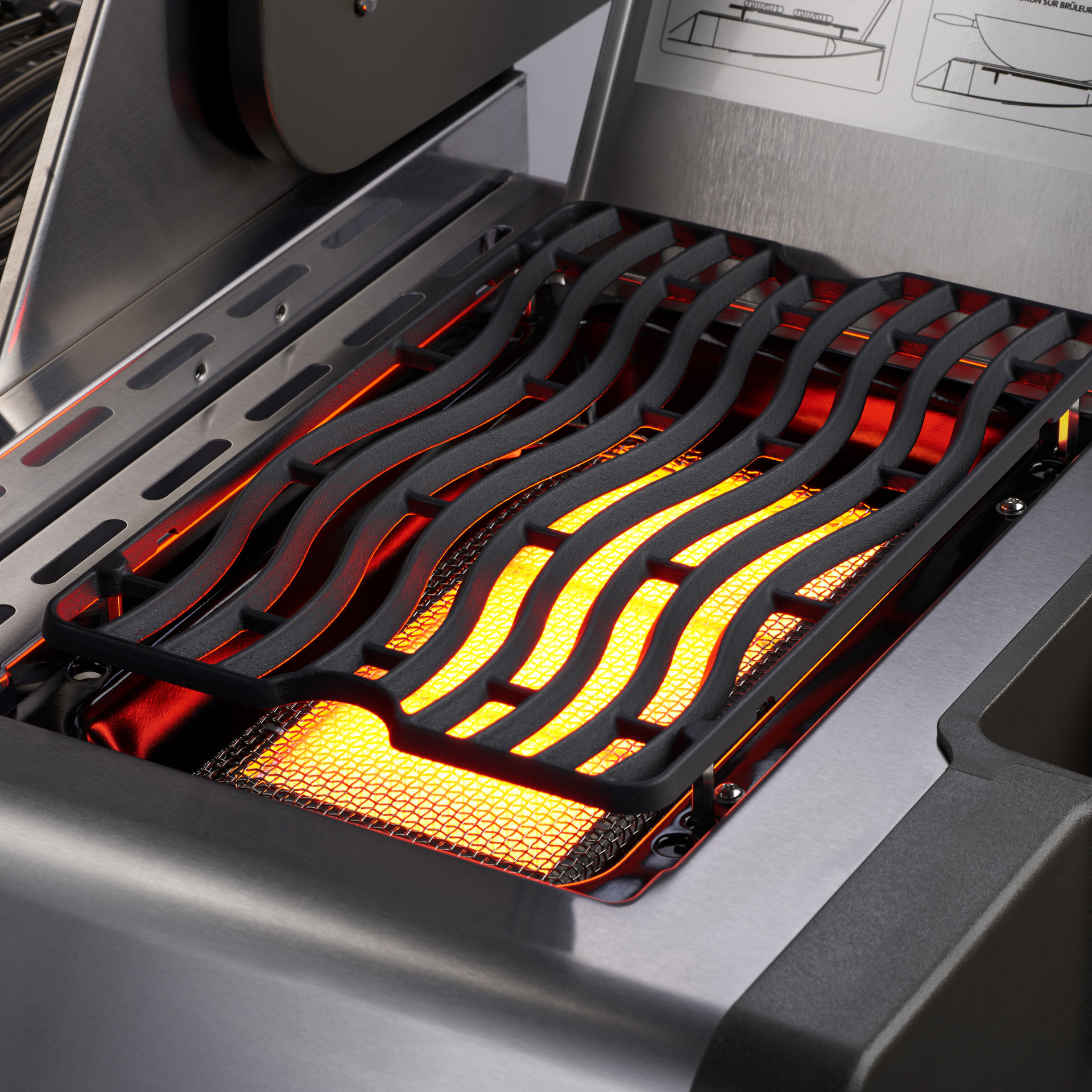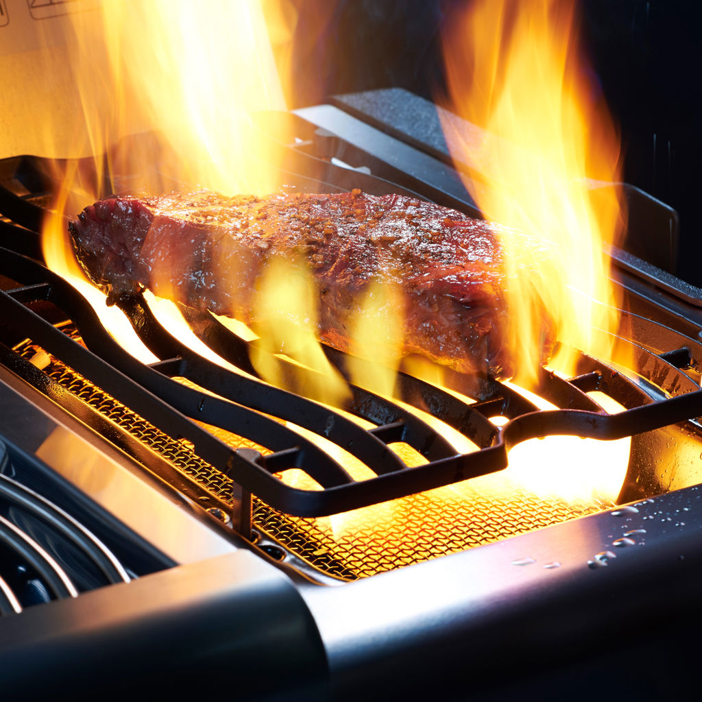 Quatre brûleurs principaux offrent un contrôle exceptionnel de la saisie et de la chaleur pour la cuisson, le fumage et le rôtissage. Le brûleur latéral infrarouge SIZZLE ZONE atteint des températures de cuisson idéales en quelques secondes et chauffe la grille de cuisson en fonte pour des steaks de qualité restaurant.