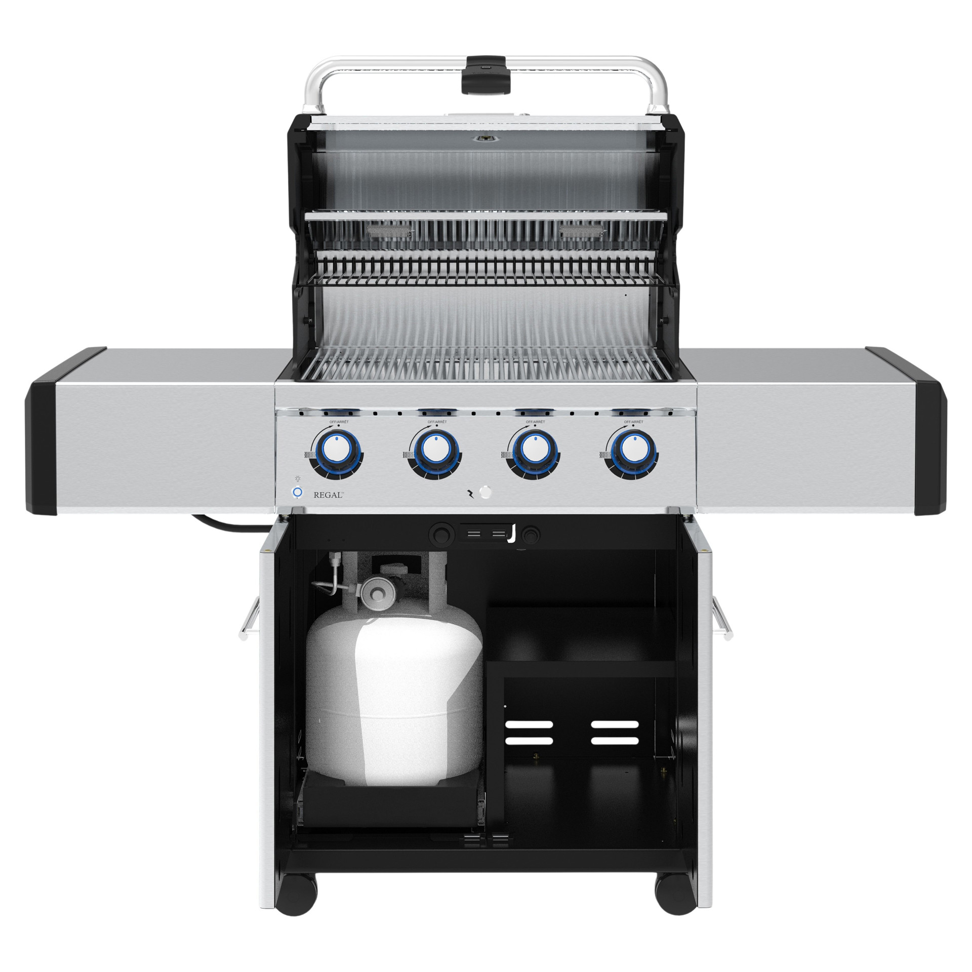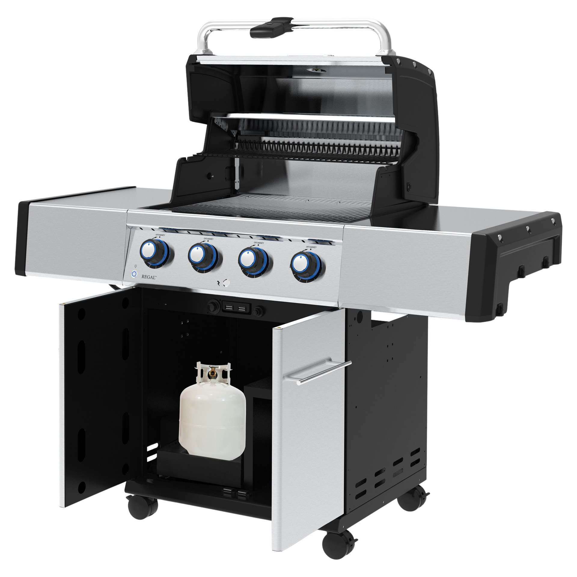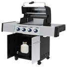 • Une base fermée style armoire avec tiroir à bouteille de propane coulissant