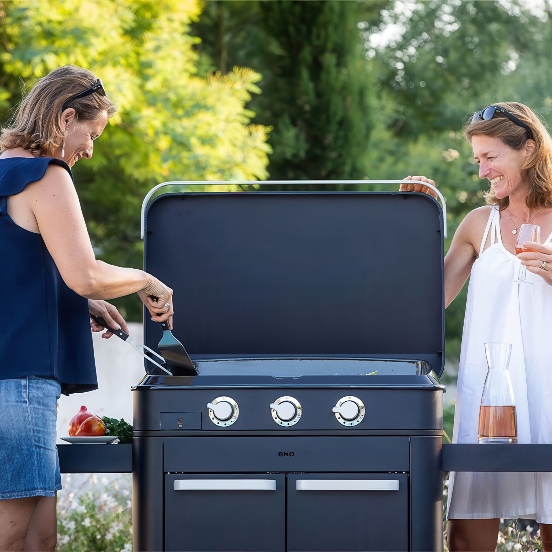 Son système de charnières à frein et sa poignée en aluminium rendent son ouverture et la fermeture du capot facile. Pour plus de confort, le capot est entièrement démontable de la plancha.