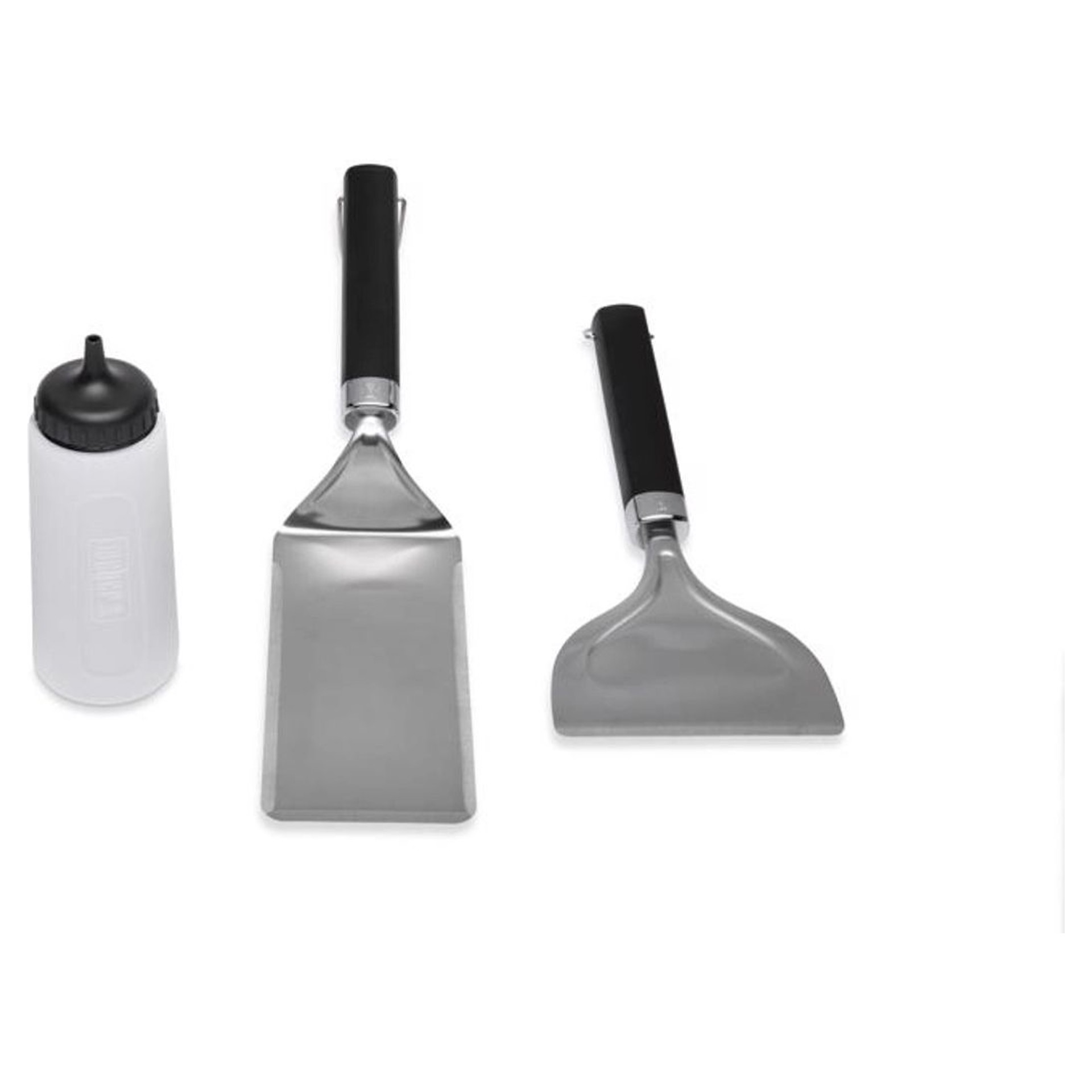 Ensemble de 3 pièces à plancha Weber. Contient une spatule durable, un grattoir et une bouteille compressible