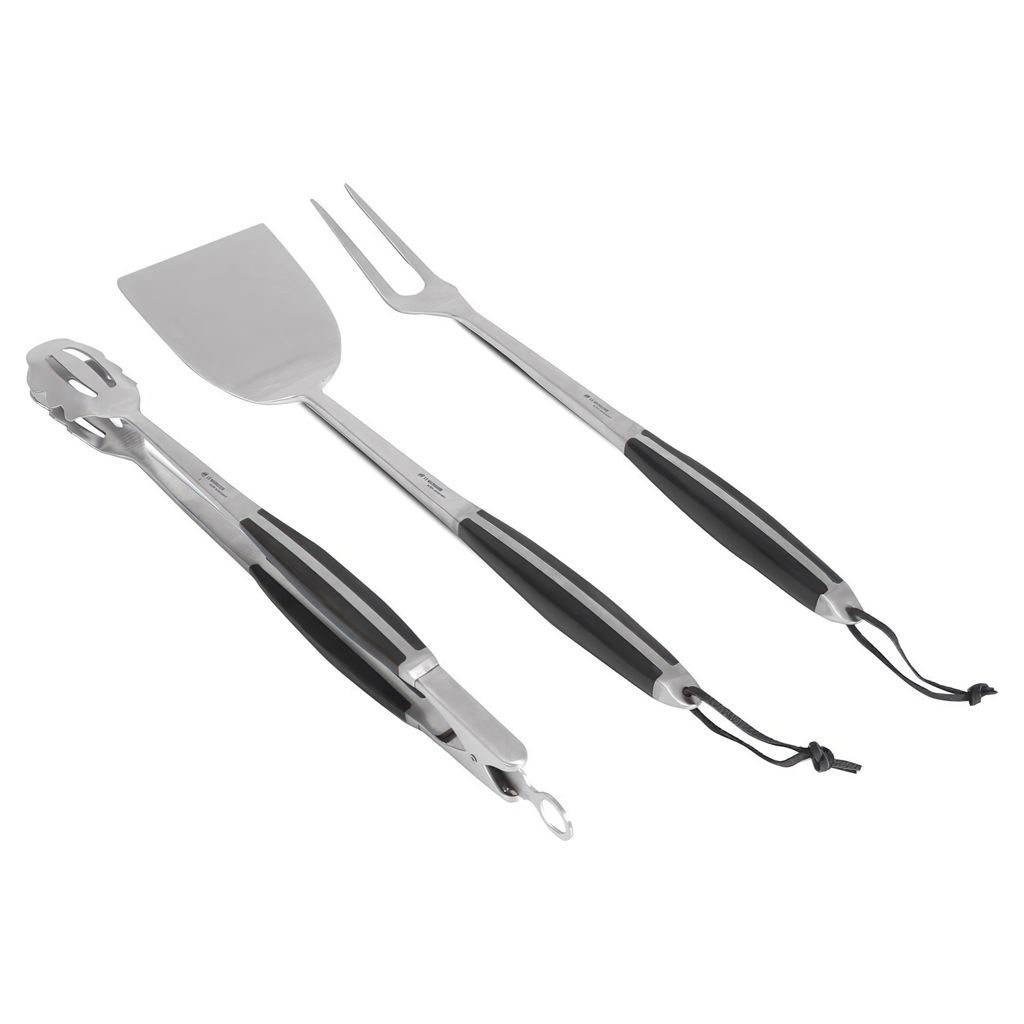 En acier inoxydable, l'ensemble comprend une spatule, une fourchette et des pinces qui peuvent être suspendues.
