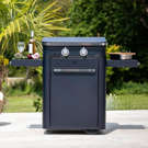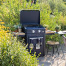 Doté d'un espace pour la bouteille de gaz, le chariot est équipé d'une barre de suspension pour les ustensiles et de tablettes rabattables facilitant la préparation.  L'acier galvanisé thermolaqué résiste à la corrosion et aux UV contrairement à l'époxy dont le coloris passera dans le temps.