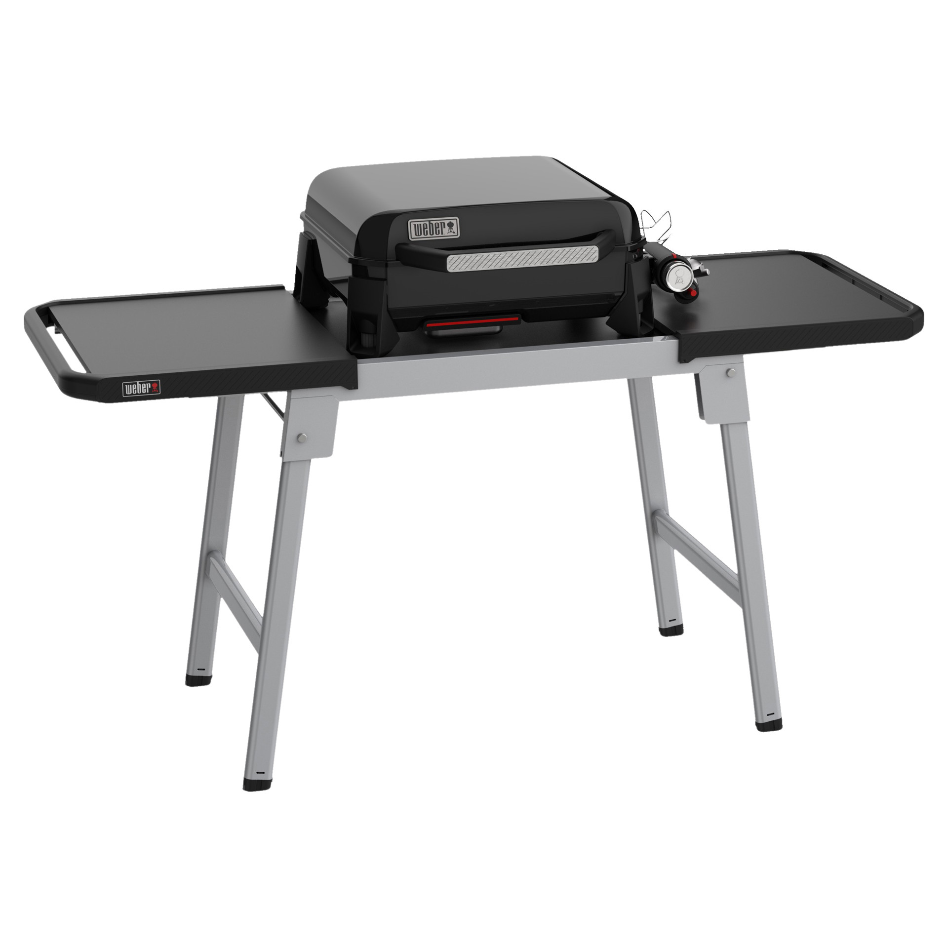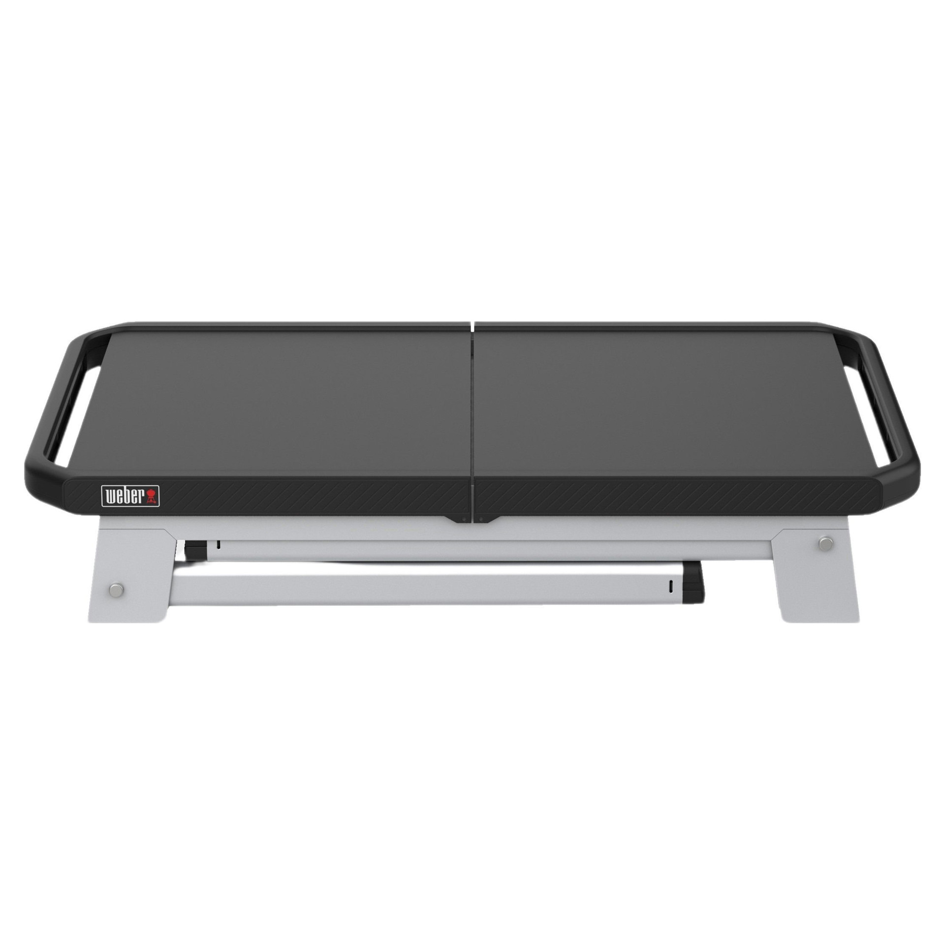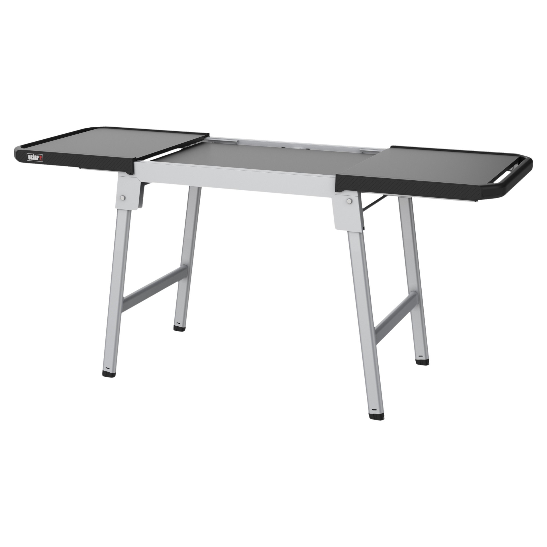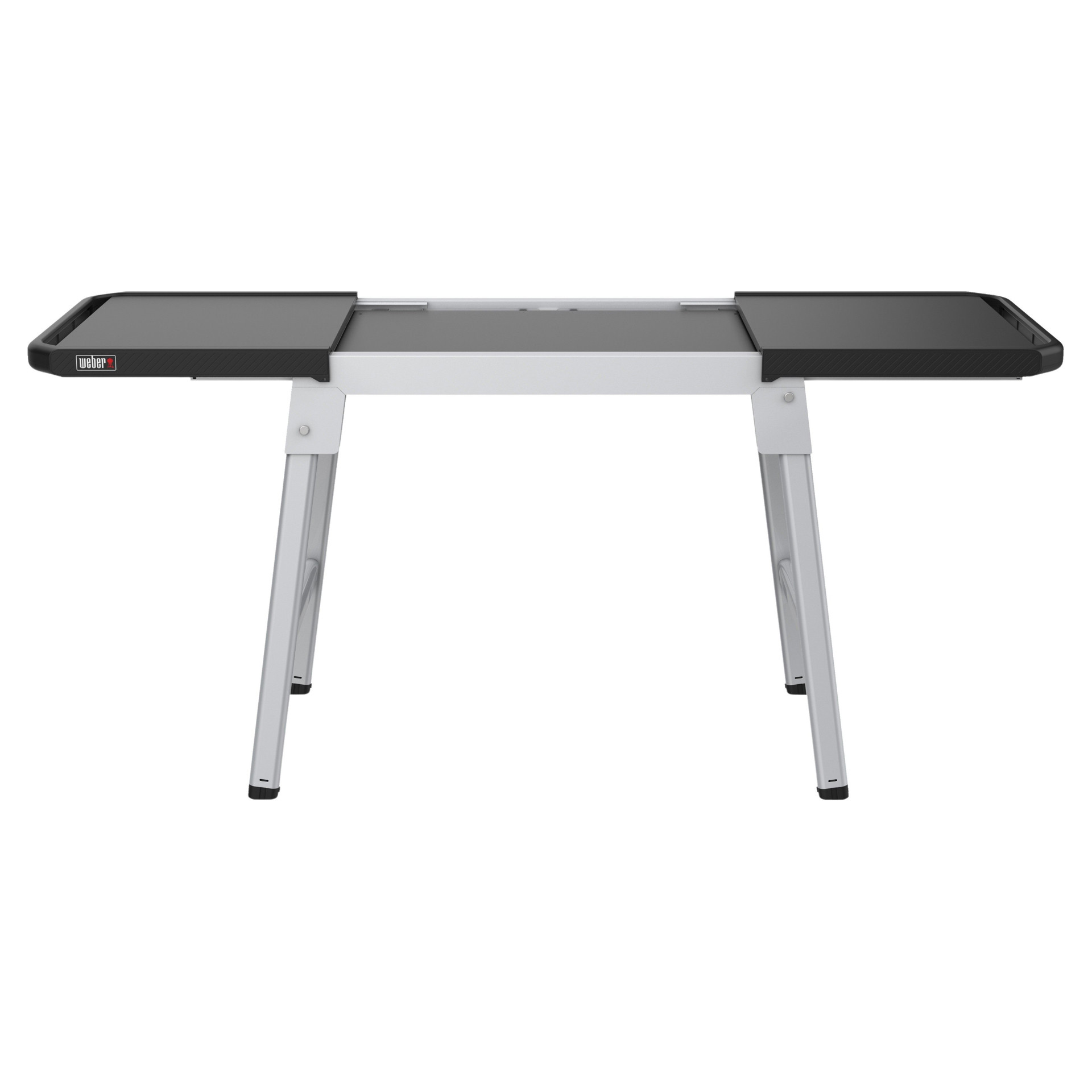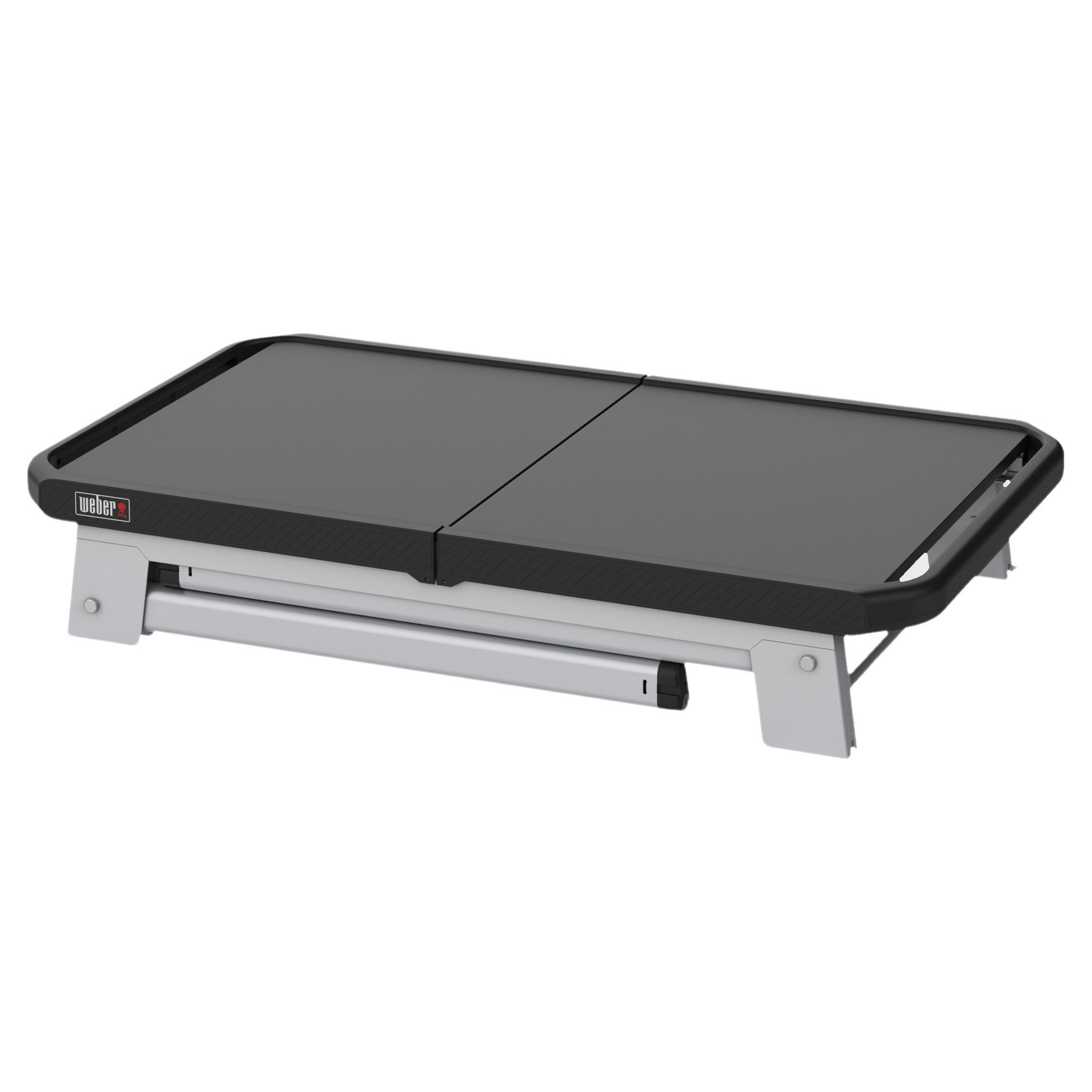 Le support extensible se range facilement dans le coffre d'une voiture et se déploie tout aussi facilement une fois arrivé à destination. Son design innovant comprend des pieds réglables pour une stabilité optimale de la plaque de cuisson sur différentes surfaces. Ses deux tablettes latérales se replient l'une sur l'autre lorsque la plaque de cuisson est retirée, formant ainsi une table de service.