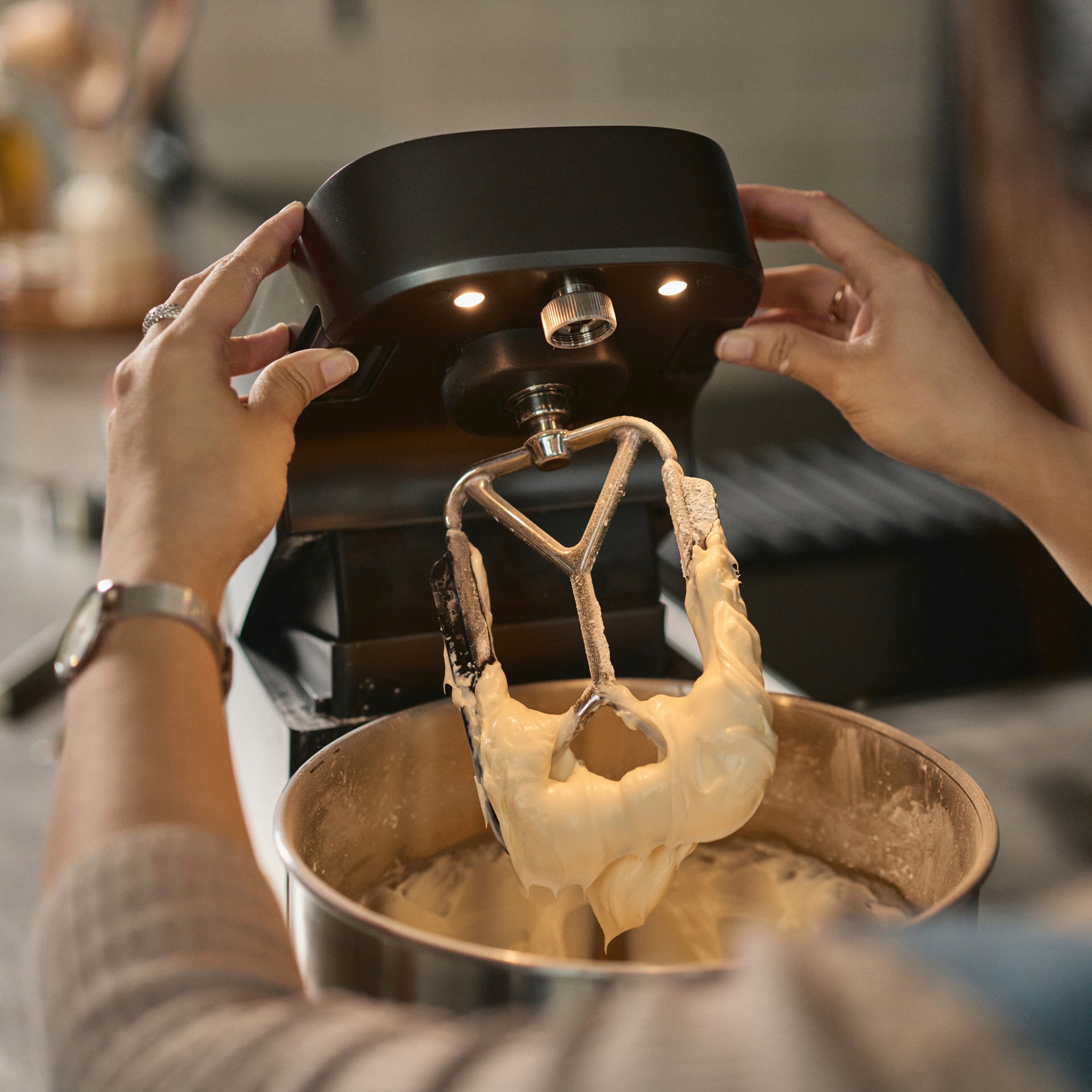 La plupart des mélangeurs à spirale traditionnels ne servent qu'à faire de la pâte. Nous étions conscients que notre mélangeur Halo Pro devait être bien plus polyvalent pour mériter sa place dans votre cuisine. Le mécanisme d'inclinaison de la tête du Halo Pro de Ooni et la barre de rupture amovible, en instance de brevet, permettent de changer d'accessoire rapidement et facilement, ce qui offre des possibilités infinies pour les pâtissiers amateurs.