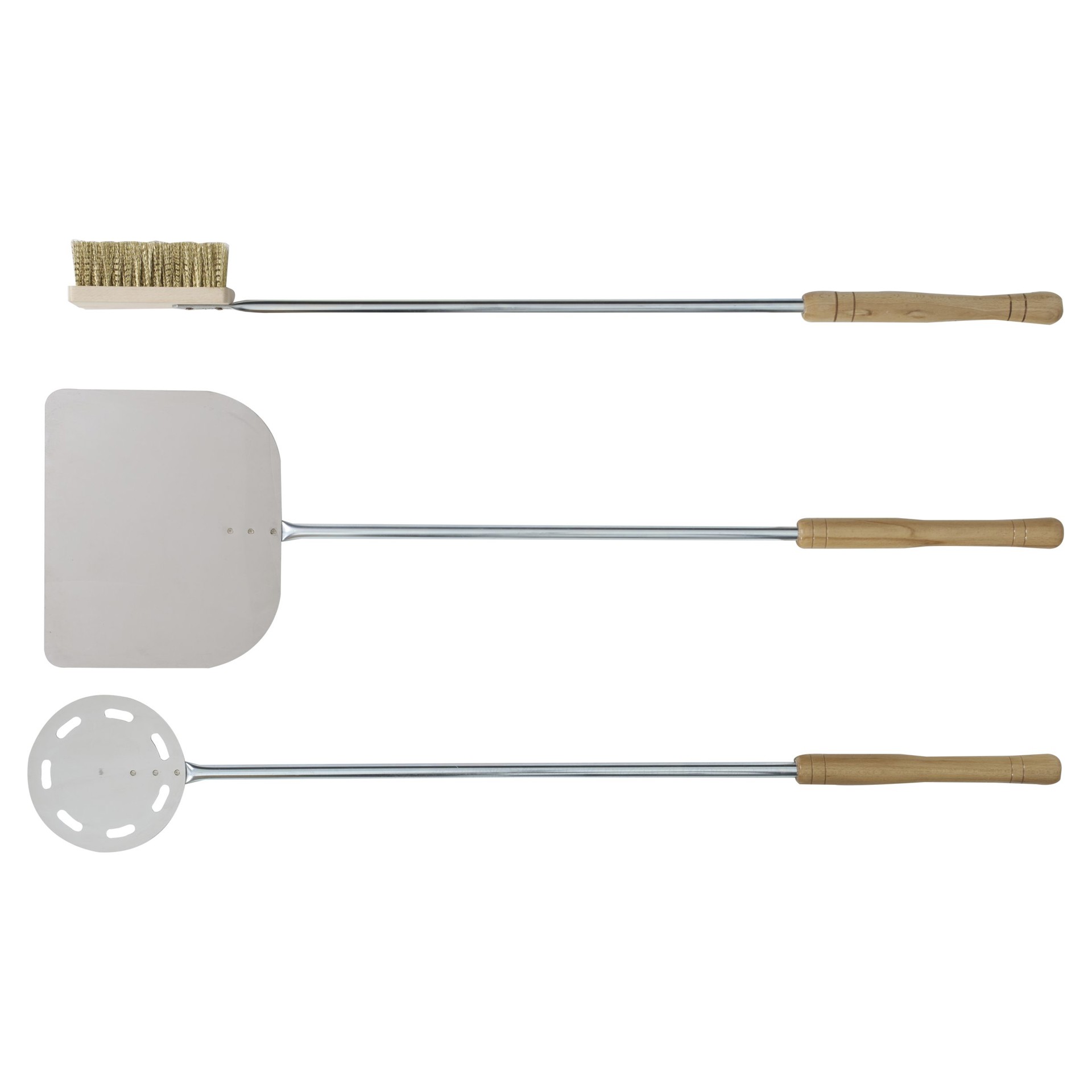 Ce kit pratique comprend une pelle ronde en acier inoxydable et une pelle rectangulaire, un grattoir et la brosse pour nettoyer la surface réfractaire. Tout ce dont vous avez besoin pour cuire une pizza de manière très simple !