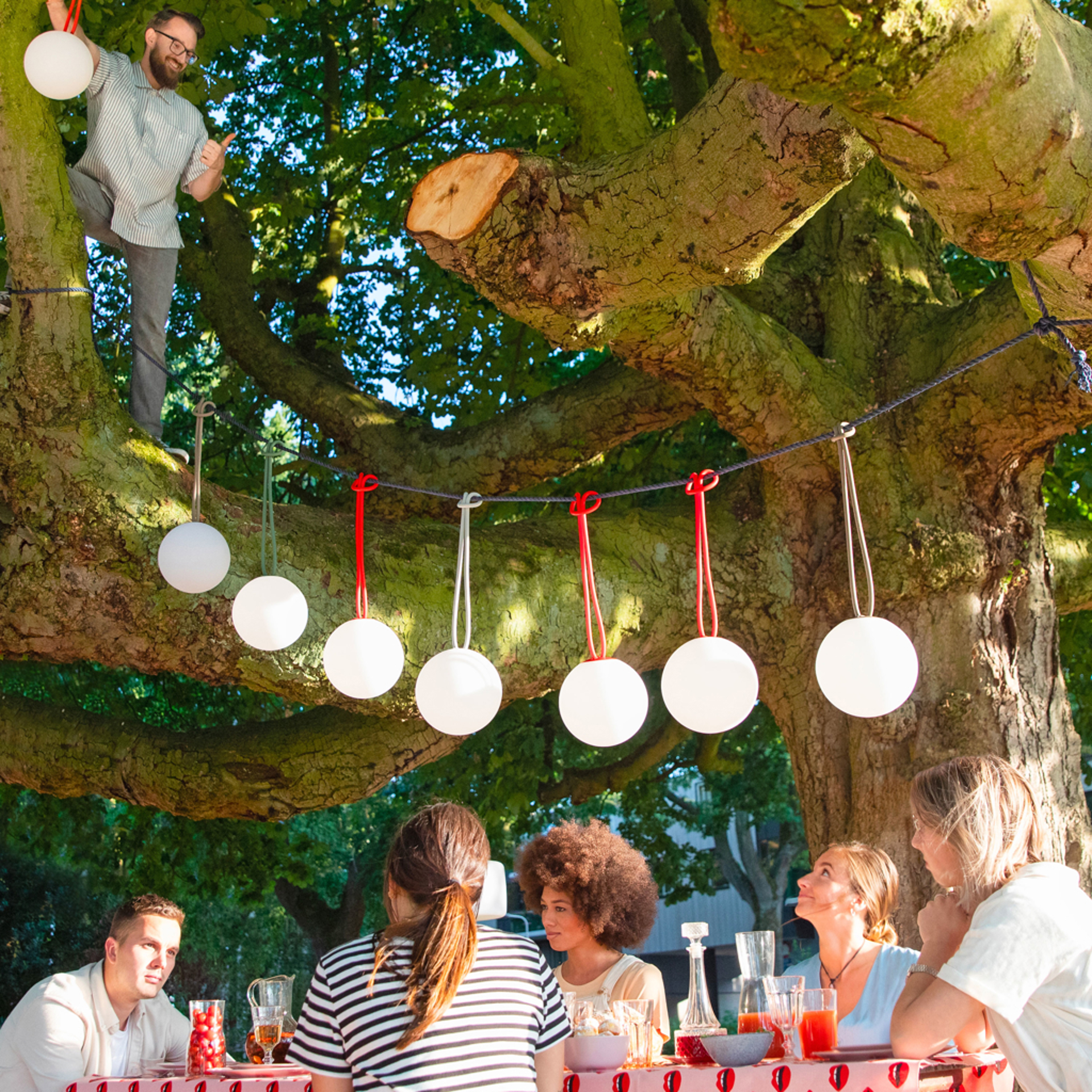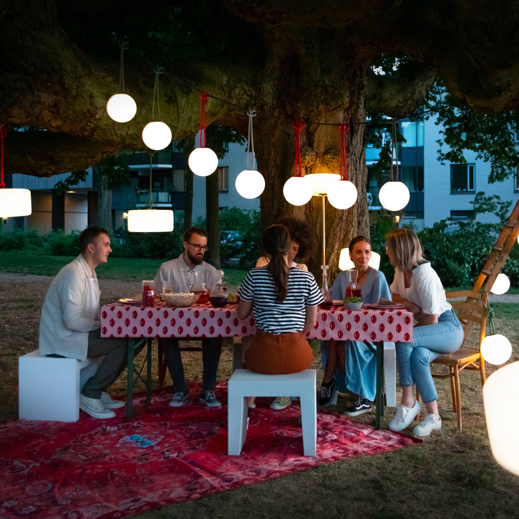 La lampe Bolleke créera une ambiance ultime. Partout où vous l'utiliserez. Et vous n'avez pas besoin de prise électrique ni de rallonge. Cette boule lumineuse peut facilement être suspendue à une corde ou à un crochet, sur un arbre ou sous votre parasol. Il est temps de rentrer parce qu'il commence à faire nuit? Pourquoi? Avec Bolleke, la soirée ne fait que commencer.