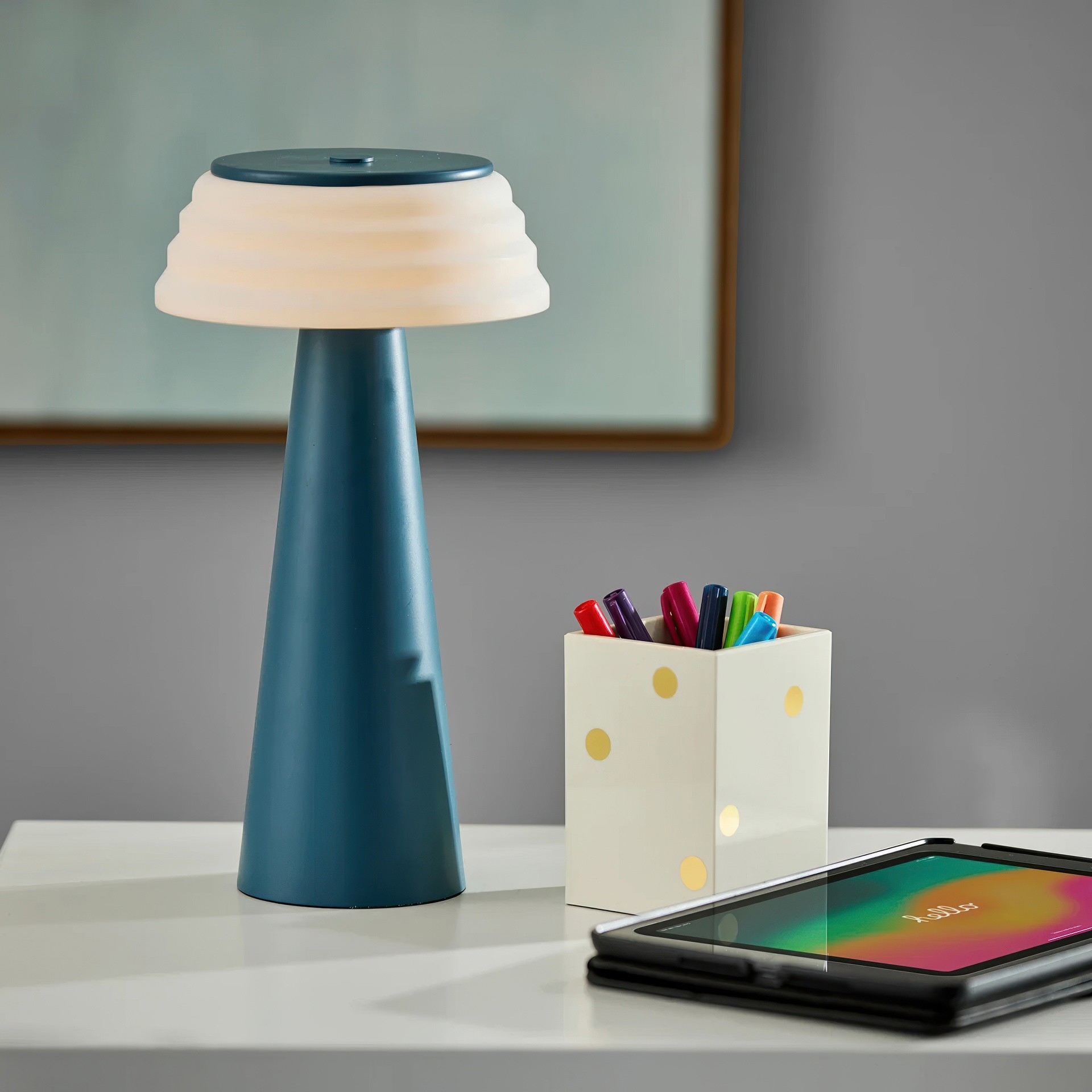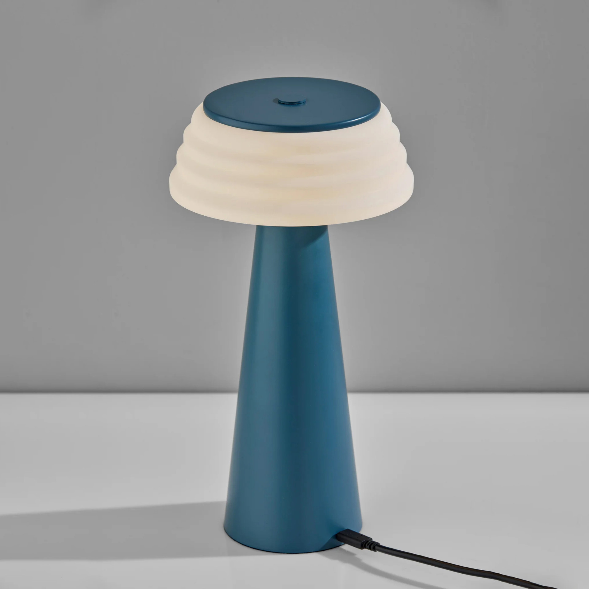 Dotée d'une charmante finition bleue et d'un abat-jour en plastique blanc nervuré, cette lampe ajoute une touche d'élégance à n'importe quel espace. D'une hauteur de 12,5 pouces, elle est compacte mais puissante, offrant des niveaux de luminosité réglables grâce à son variateur tactile à 3 niveaux.