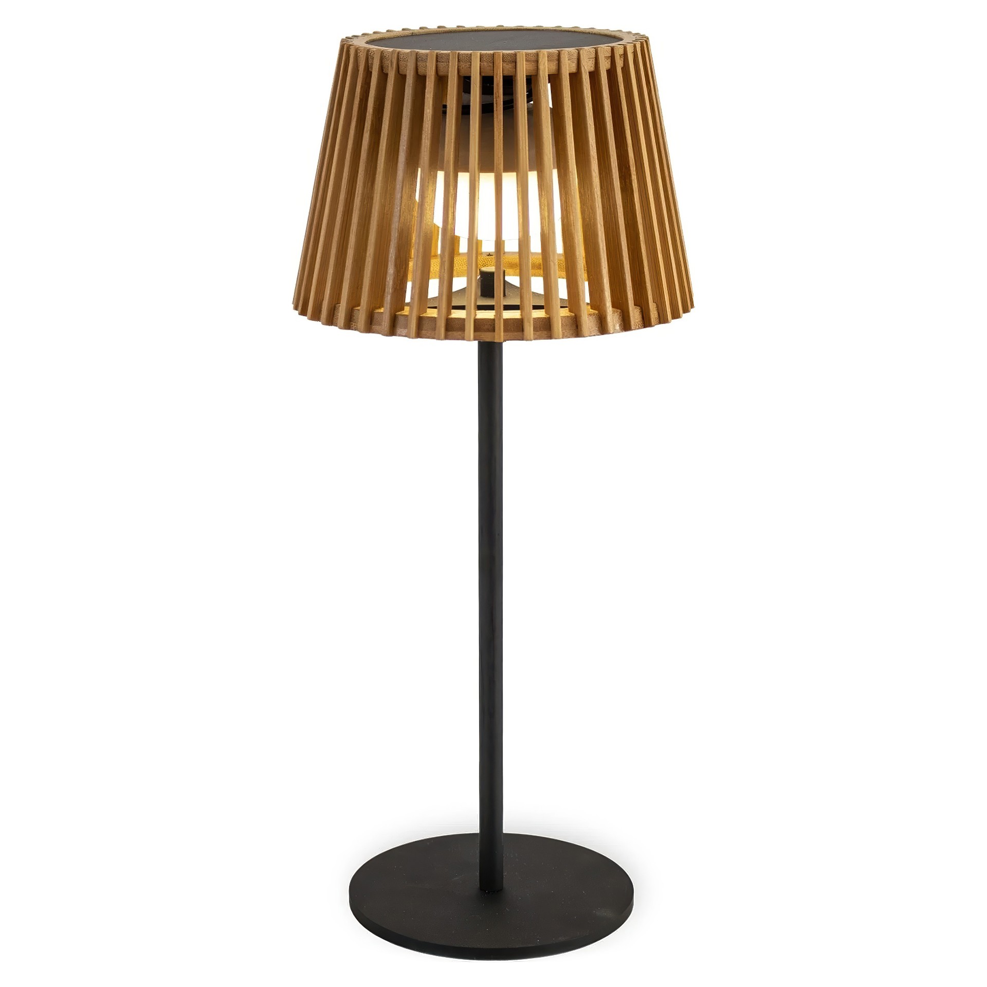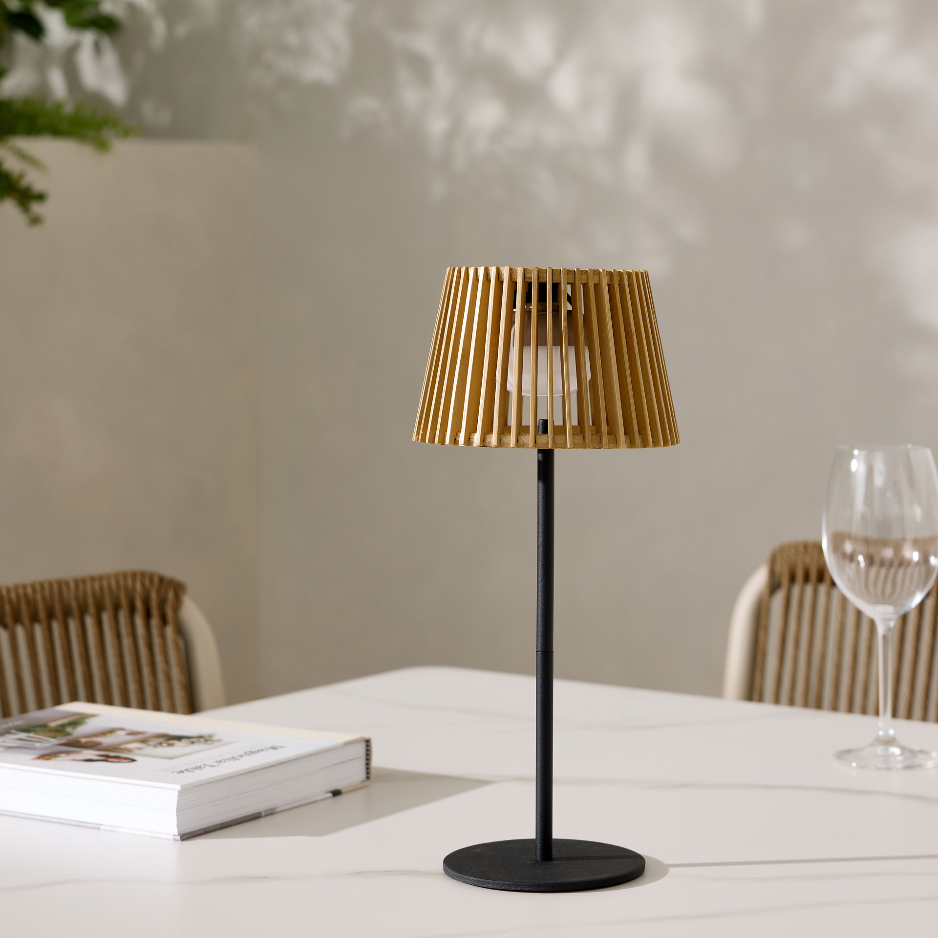 Fabriquée en bambou et en métal noir élégant, cette lampe solaire et rechargeable offre une lumière DEL chaude et dimmable (350 lm), avec une ampoule Mini Cherry et une télécommande incluses pour un réglage facile.