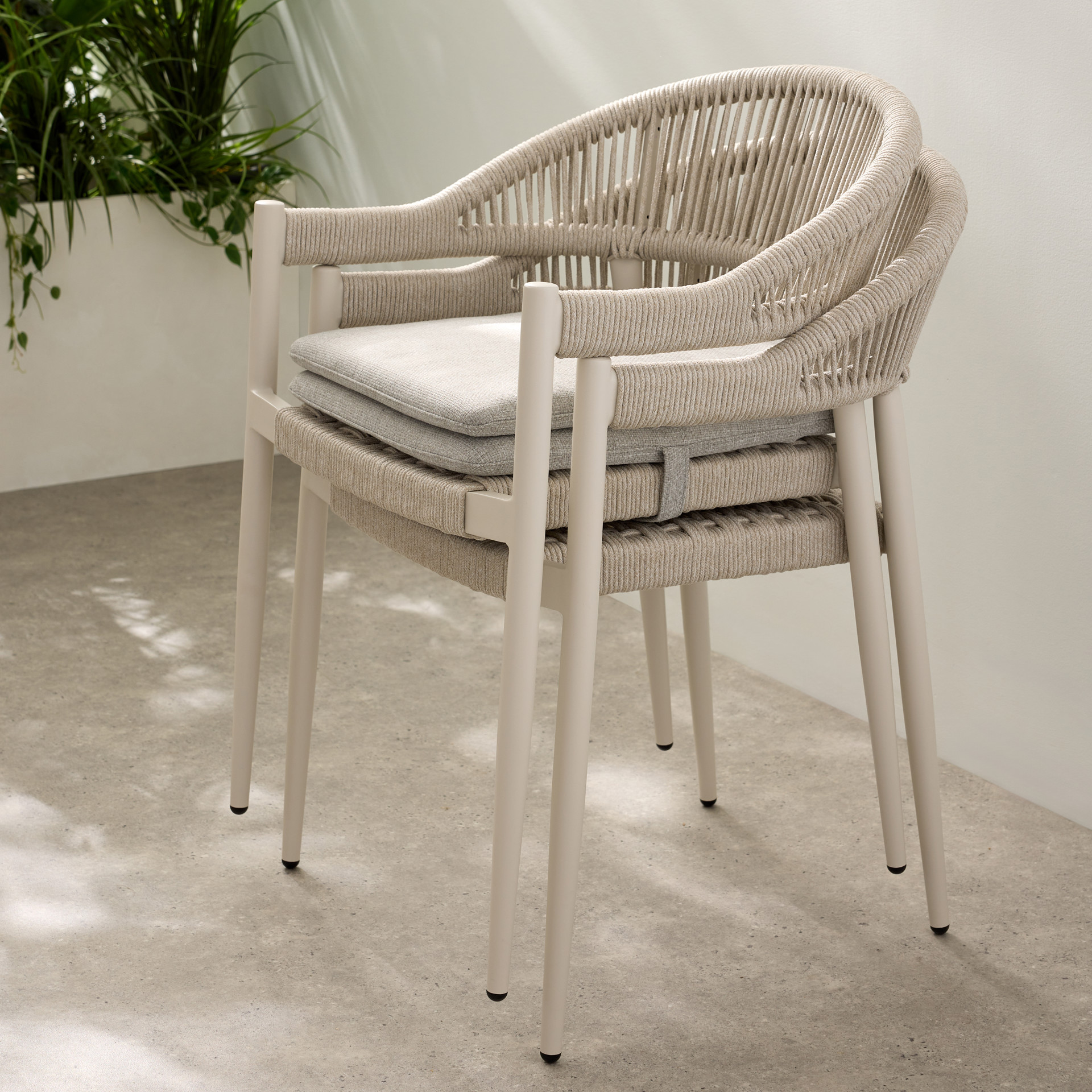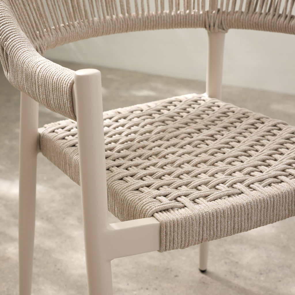 Ajoutez une touche moderne à votre espace extérieur avec ces chaises empilables en aluminium. Le détail de cordes en oléfine ajoute une touche élégante au mobilier.