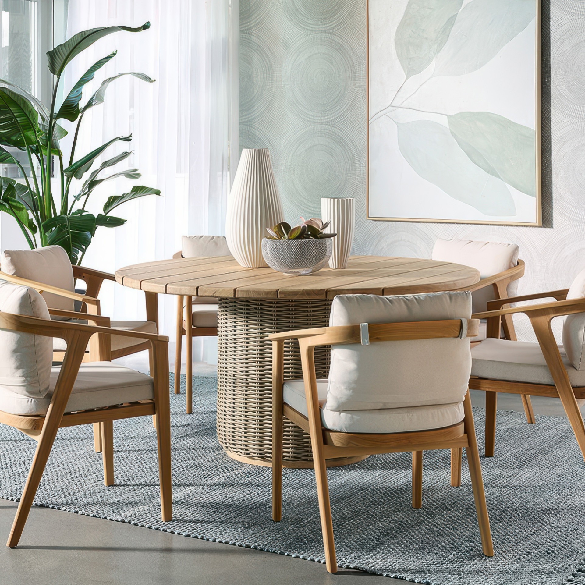 Une superbe table à manger ronde à l’attrait moderne, infusée d’une touche tropicale.