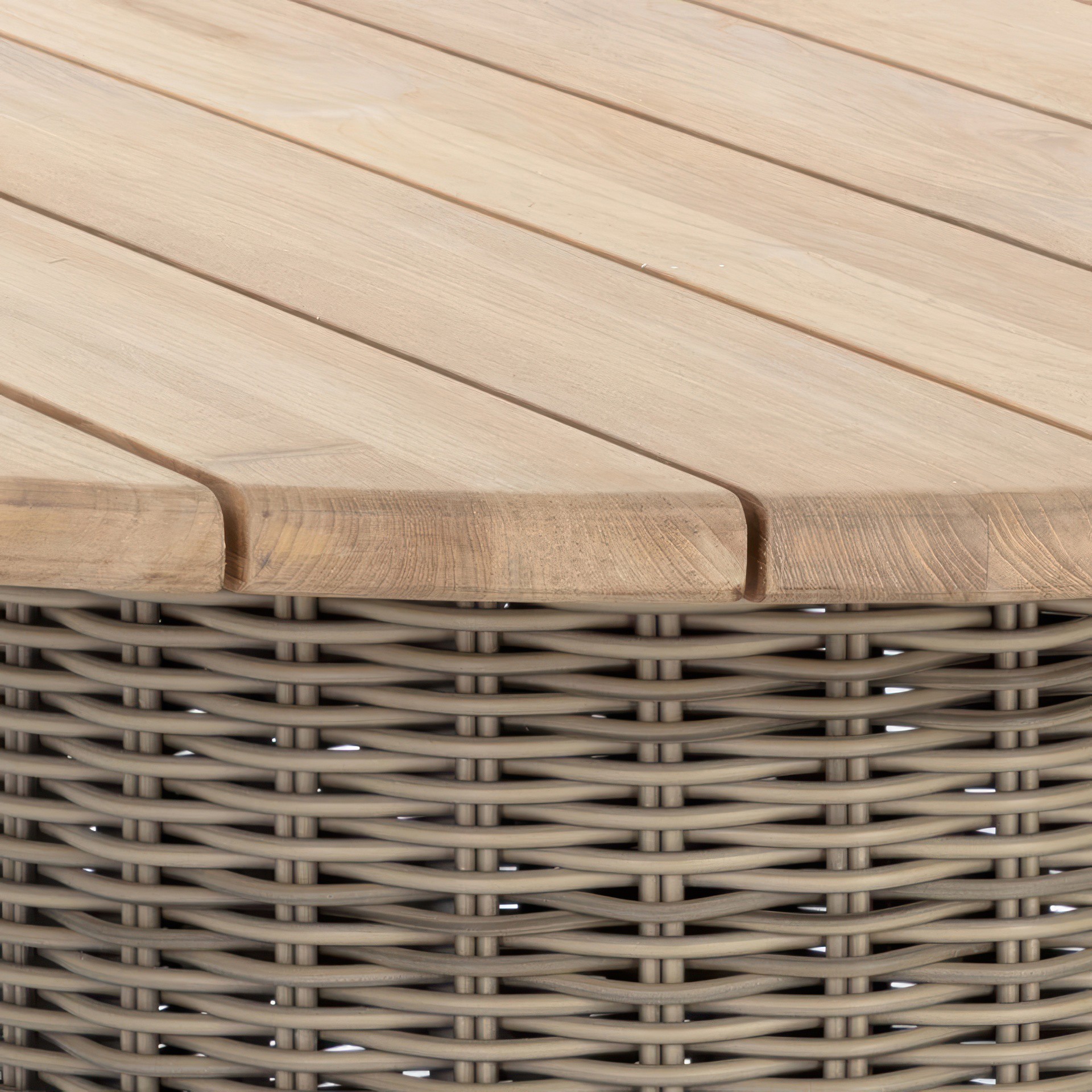 Faisant partie de la collection Outdoor de SUNPAN, il est doté d’un cadre en bois de teck massif naturel et est complété par un revêtement en tissage taupe sur la base de la table.