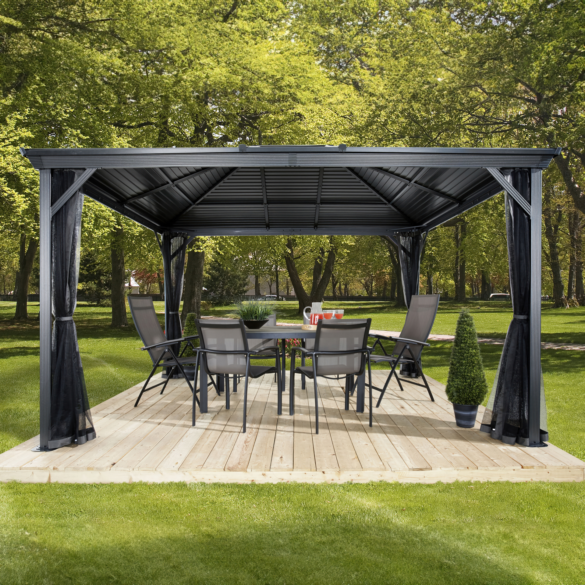 Ce gazébo aux lignes épurées saura habiller votre cour arrière tout en apportant protection pour vos invités et vous-même.