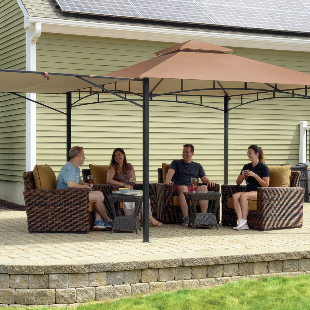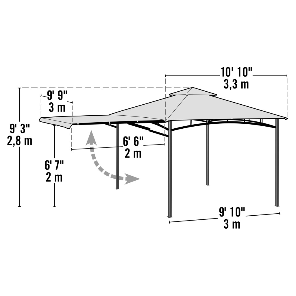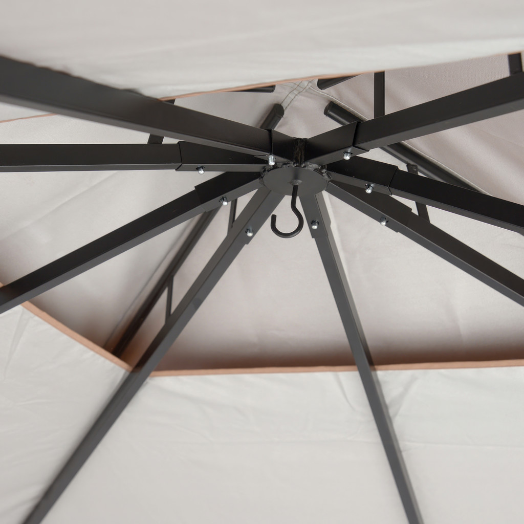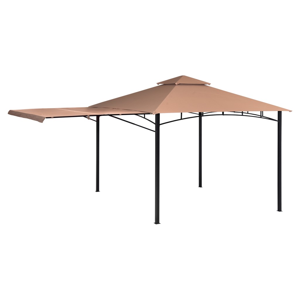 Cette unité de gazebo comporte un cadre en acier enduit de poudre et un couvercle en polyester bronze ignifuge de 3 pièces résistant à l'eau.