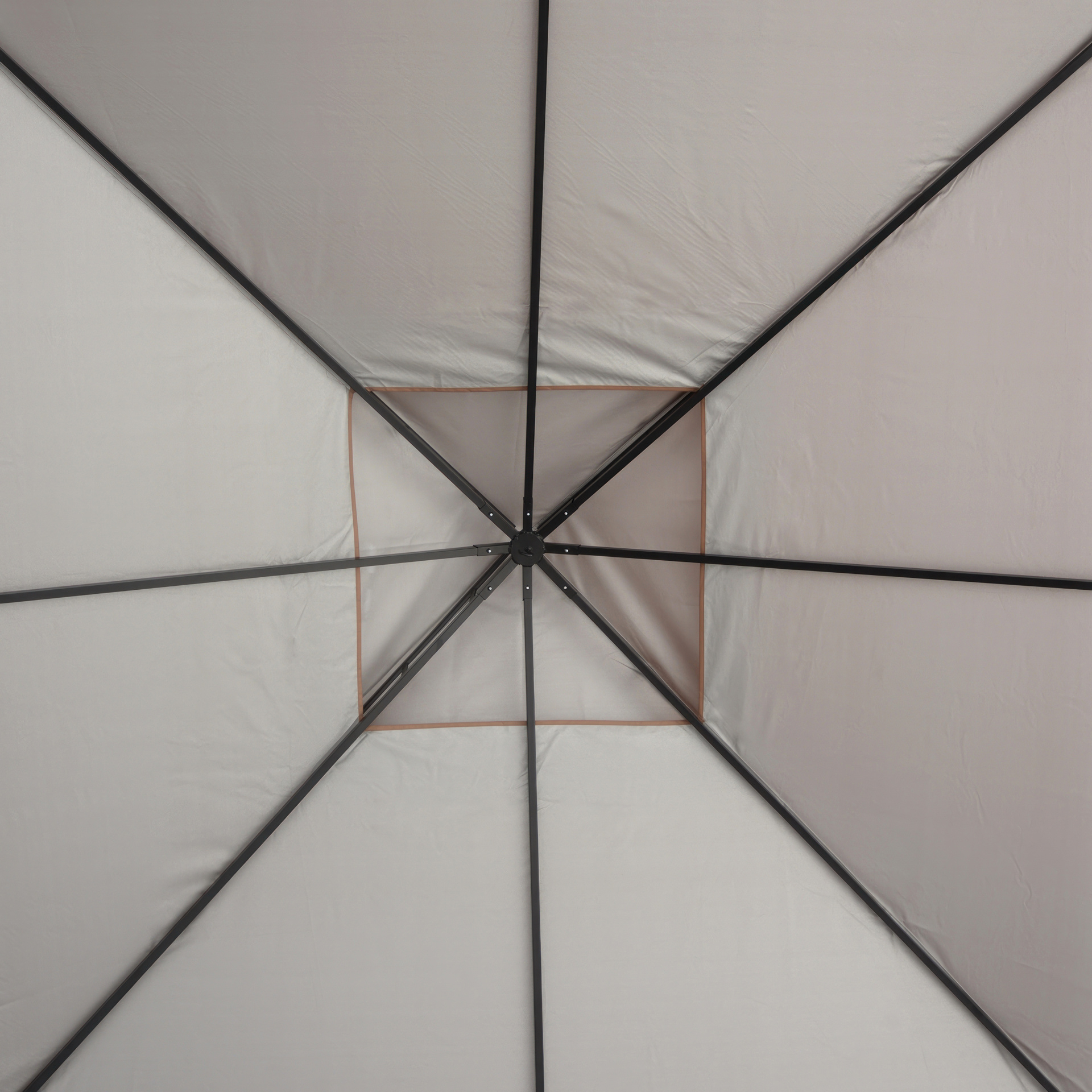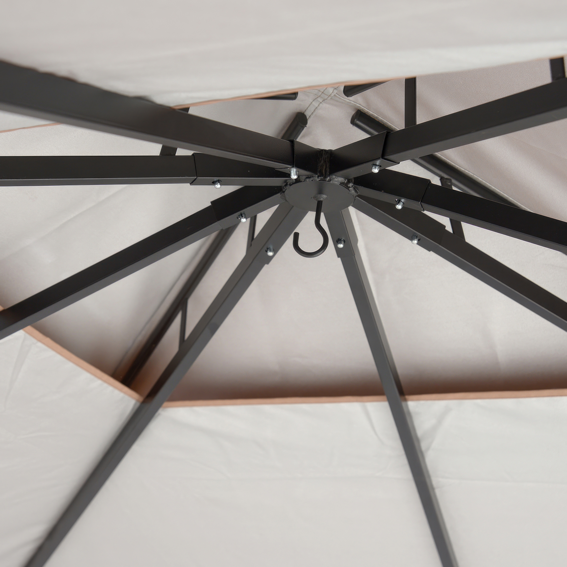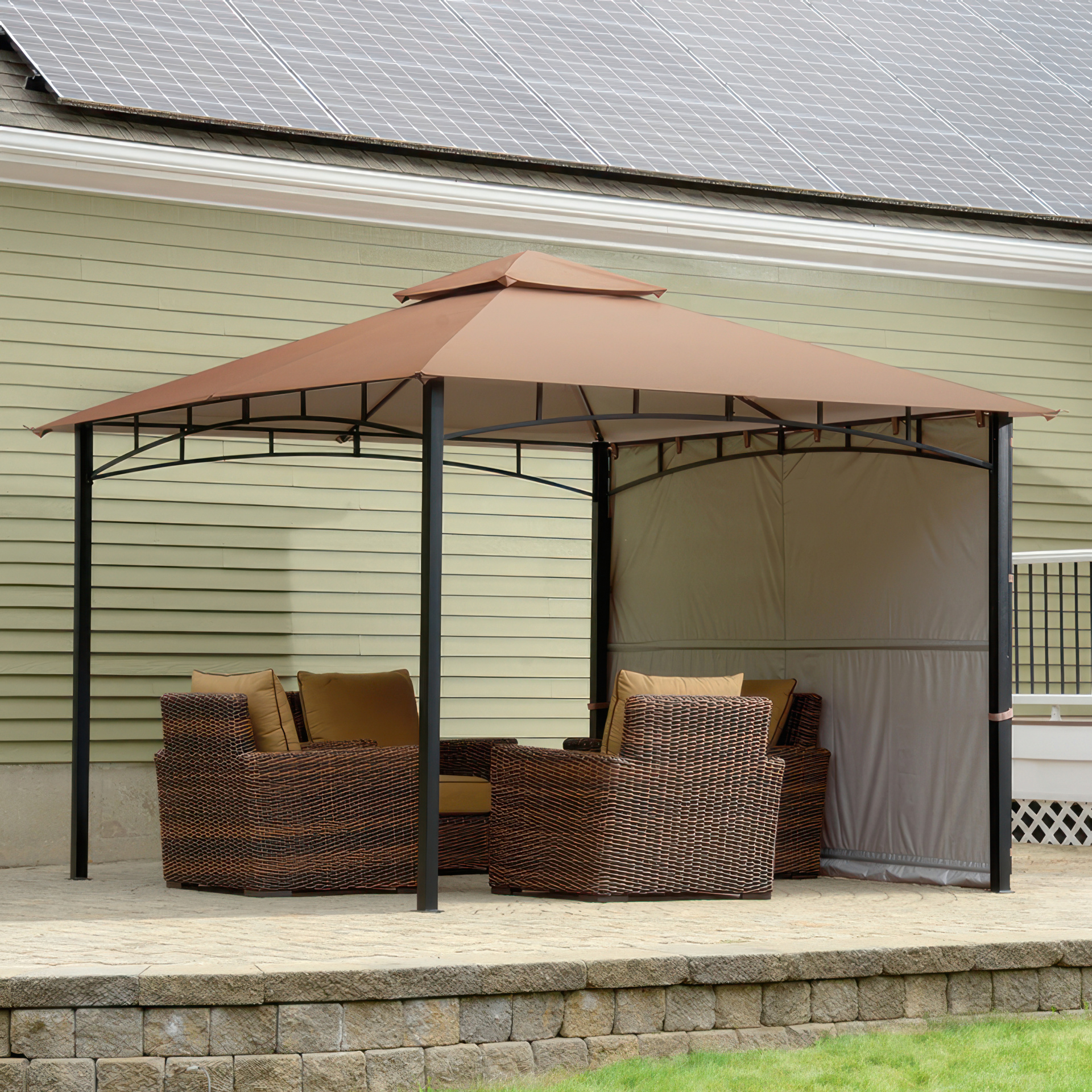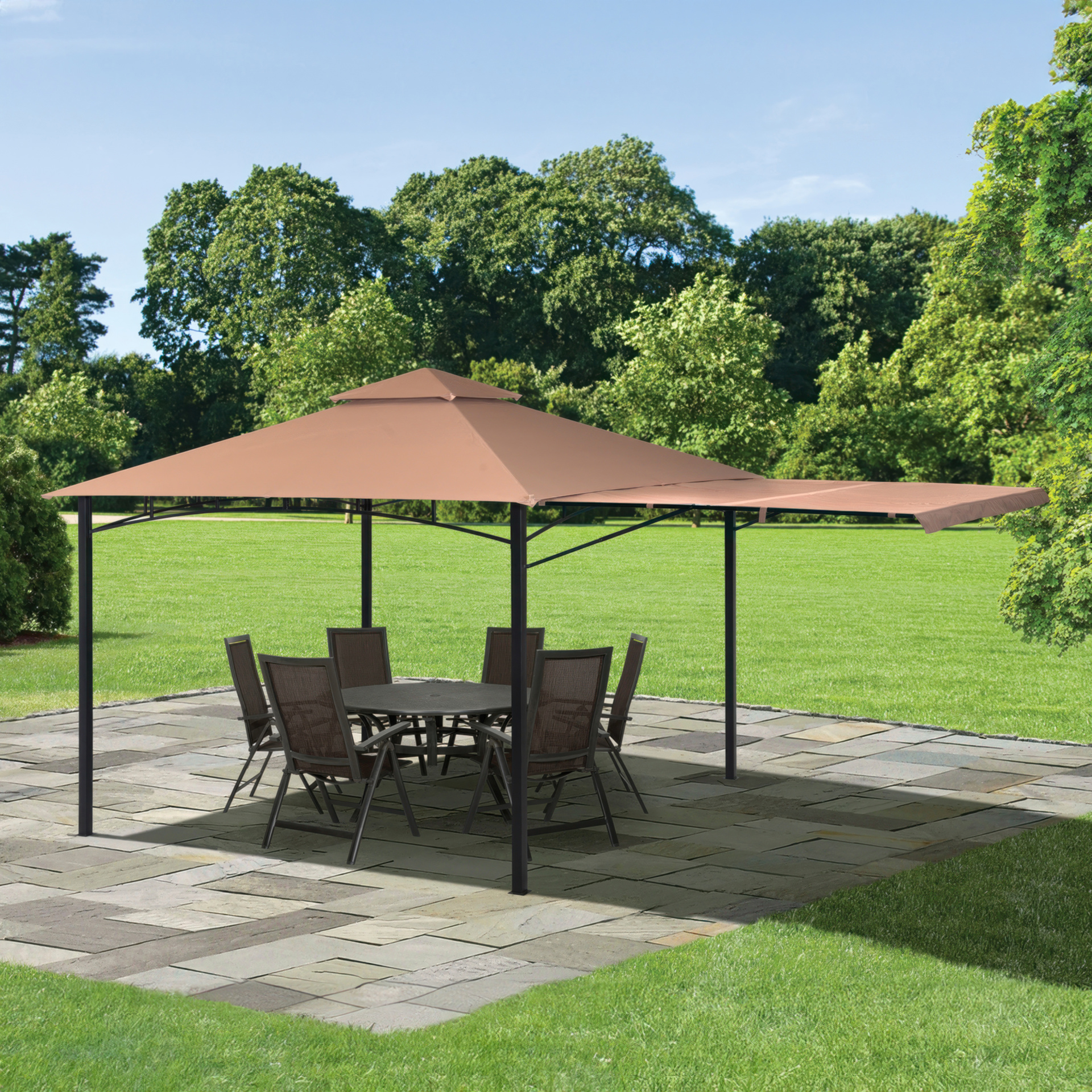 Cette unité de gazebo comporte un cadre en acier enduit de poudre et un couvercle en polyester bronze ignifuge de 3 pièces résistant à l'eau.