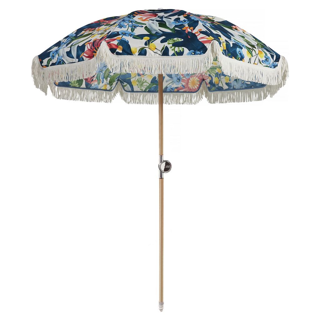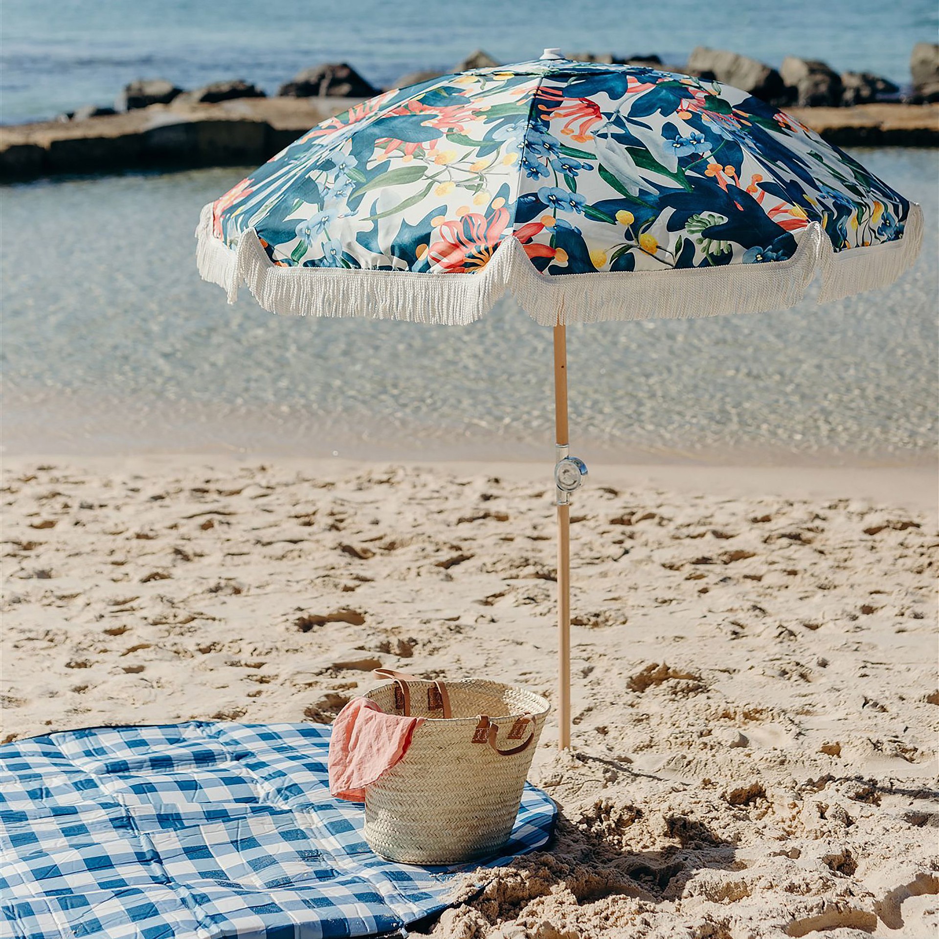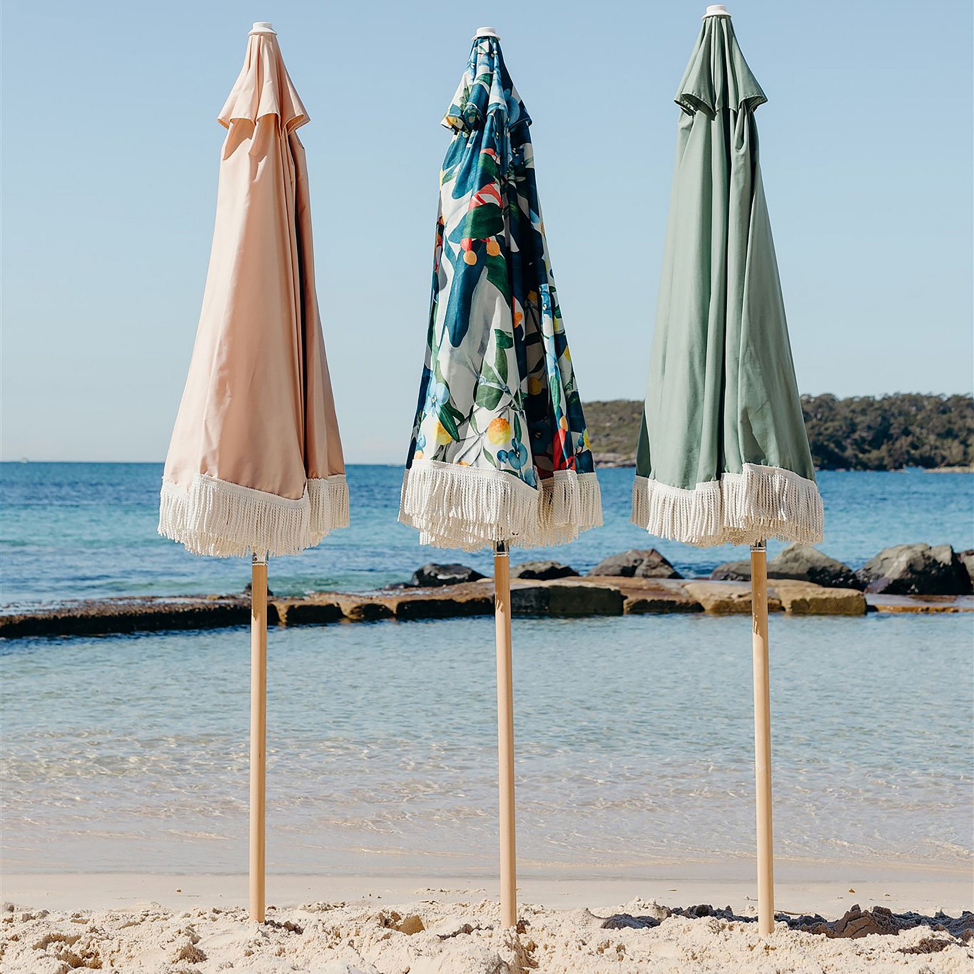 Voici le parasol Premium Beach Umbrella de Basil Bangs - une belle combinaison d'accessoires haut de gamme et de matériaux naturels.