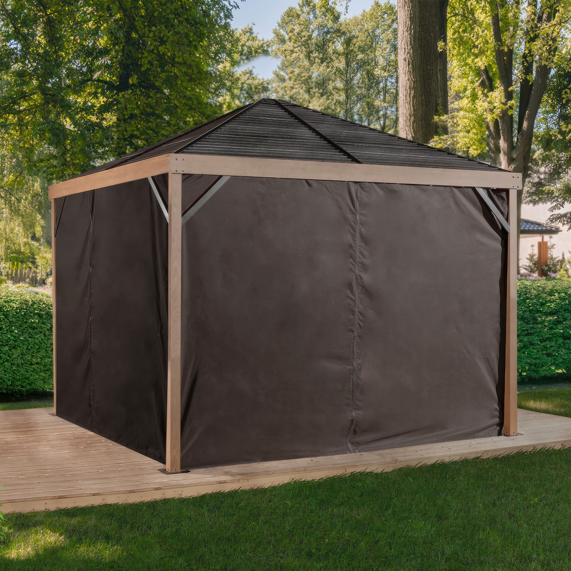 Ces rideaux d'été sont l'accessoire parfait pour votre abri Sojag. Ils sont fabriqués en polyester ce qui permet d'avoir de l'intimité et de se mettre à l'ombre pendant les journées chaudes d'été.