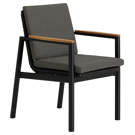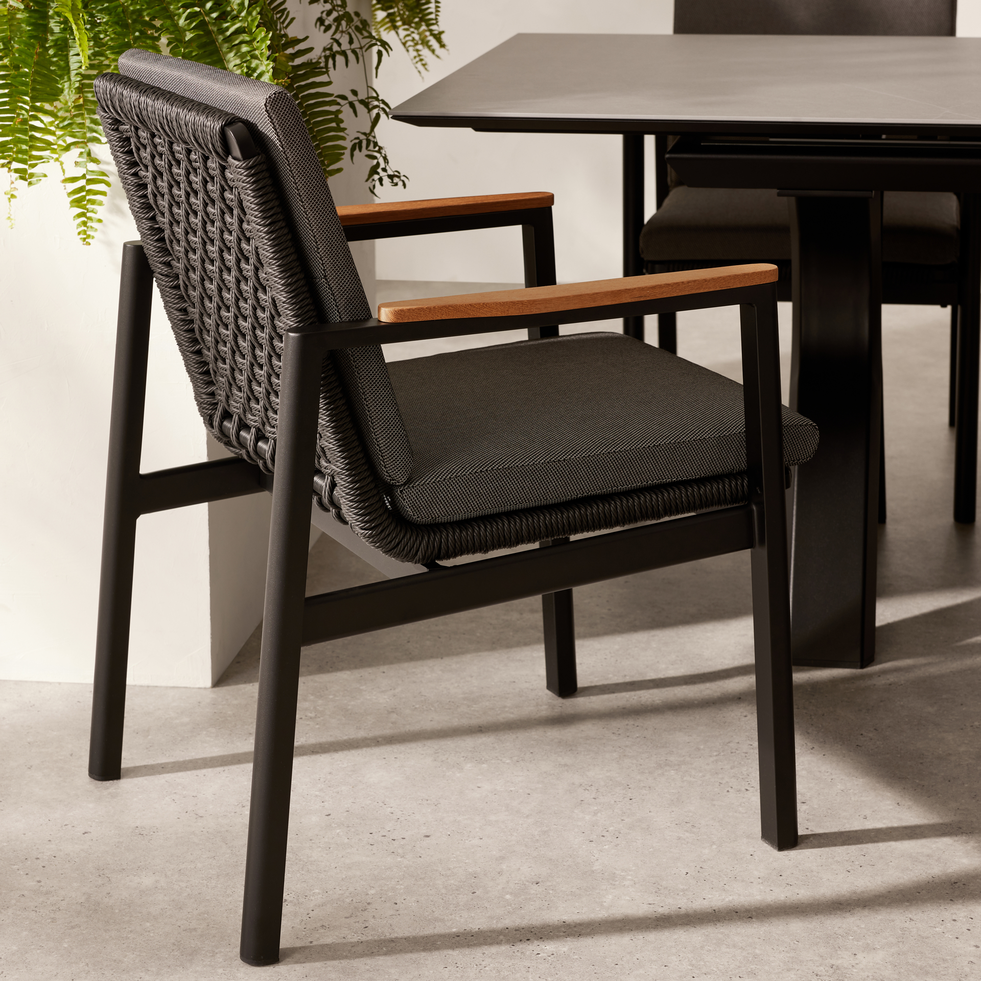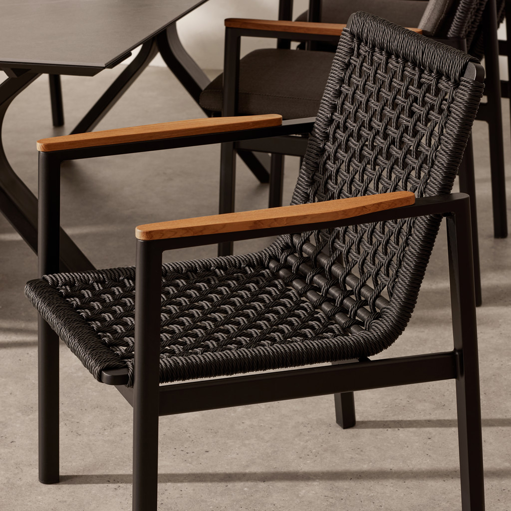 Des lignes dures et nettes et un tissage en osier tressé. Les accents en teck sur les accoudoirs complètent le cadre souple. Le cadre en aluminium est résistant à la rouille et aux intempéries et les larges lattes d’assise et de dossier permettent un drainage facile de l’écoulement. Reyne allie la sobriété moderniste à un confort sans compromis.