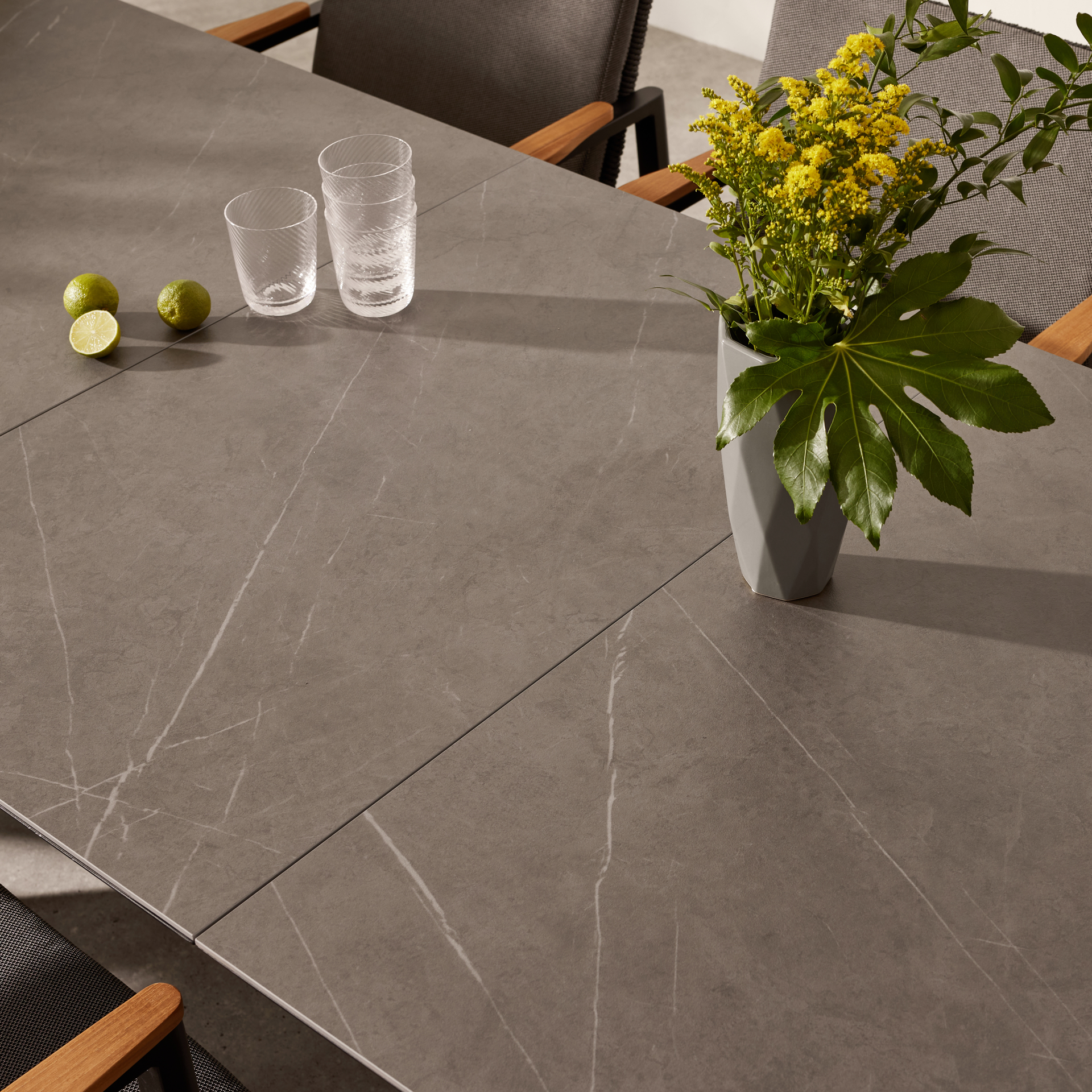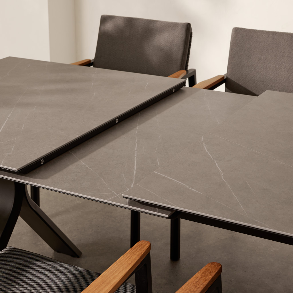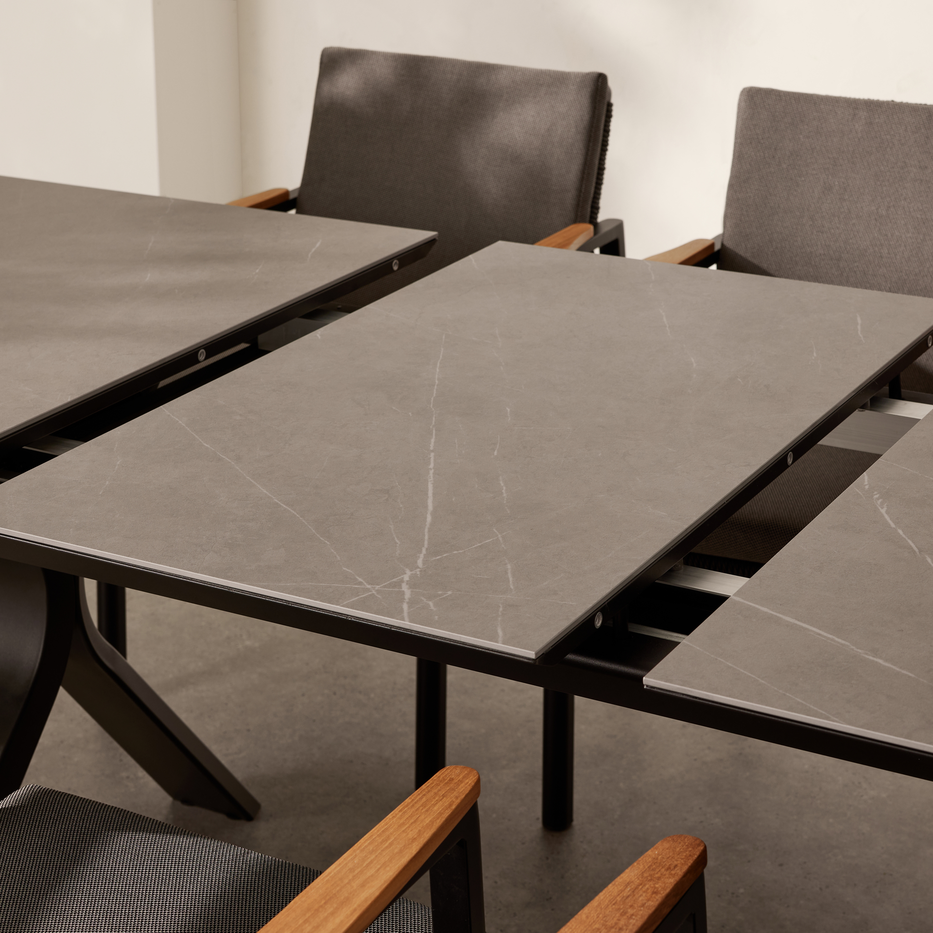 CARSON présente une table de salle à manger extensible dotée d’une base en aluminium thermo-incurvée, soigneusement conçue pour s’harmoniser avec d’élégants plateaux en céramique ou en pierre frittée.