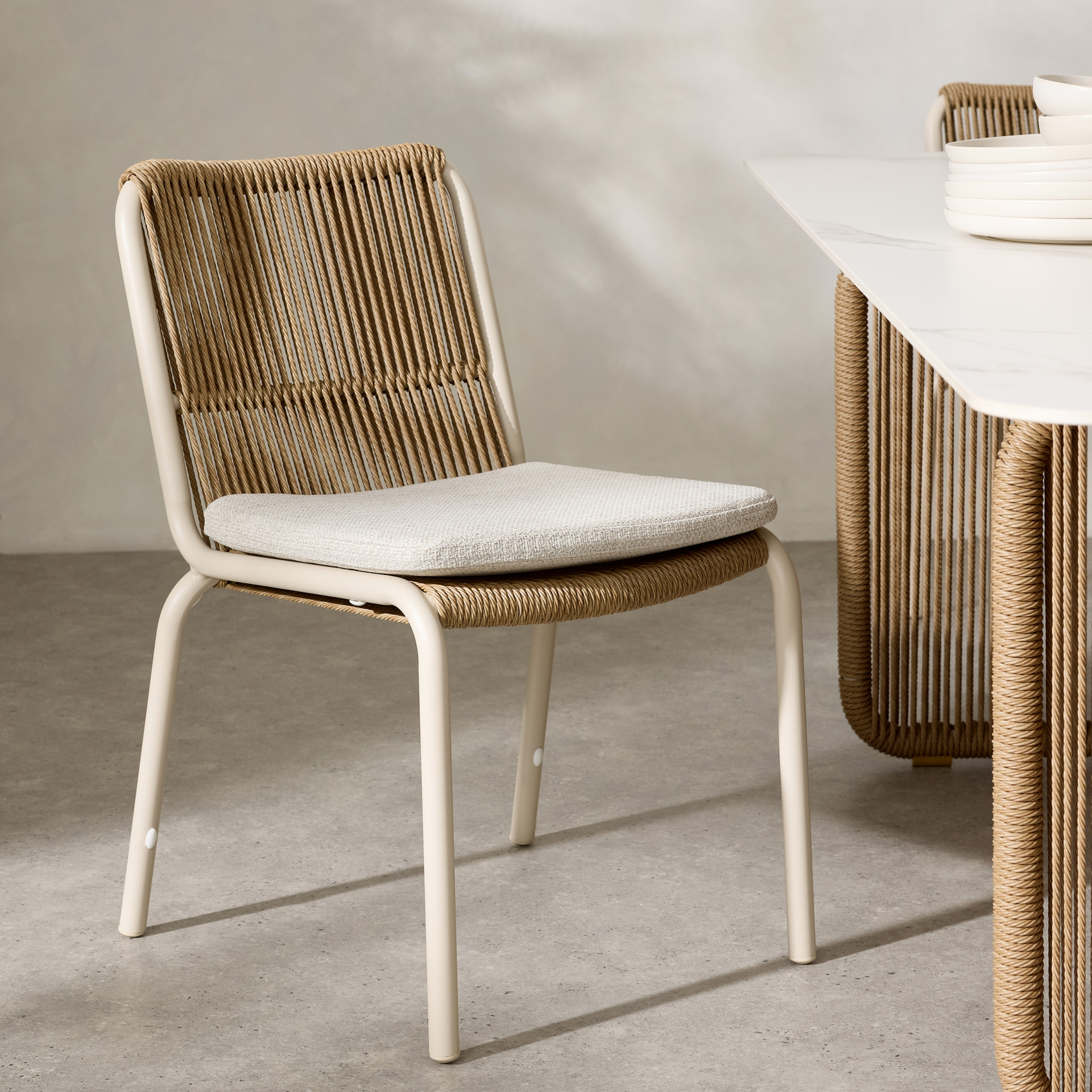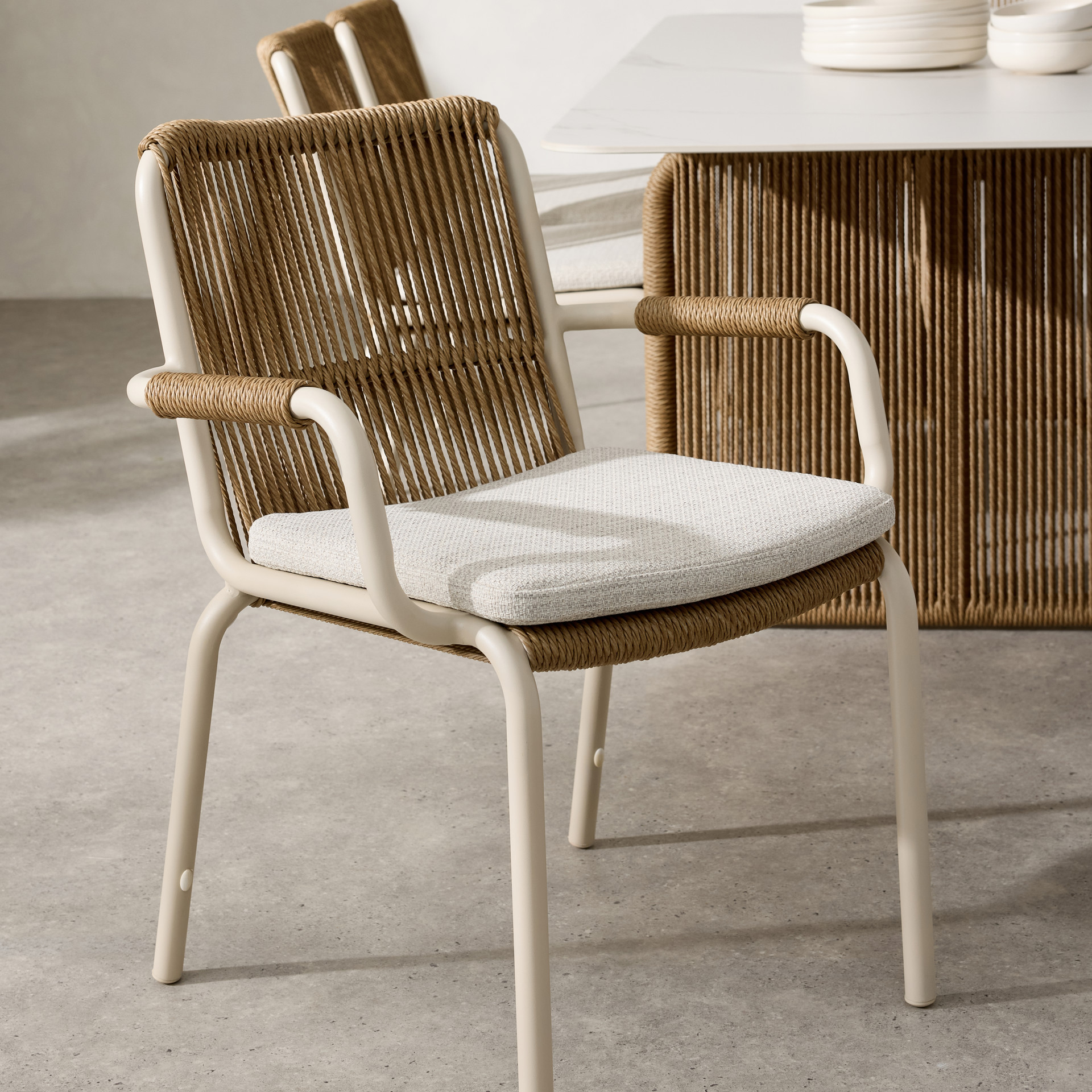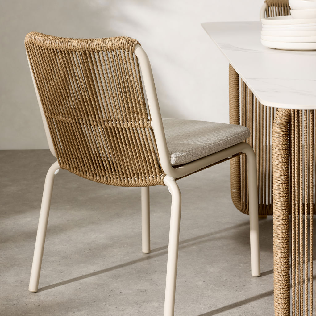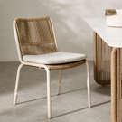 Cette chaise de salle à manger est dotée d'un tissage en osier torsadé, tandis que les cadres en aluminium avec revêtement en poudre et les coussins exposés assurent un confort stable.