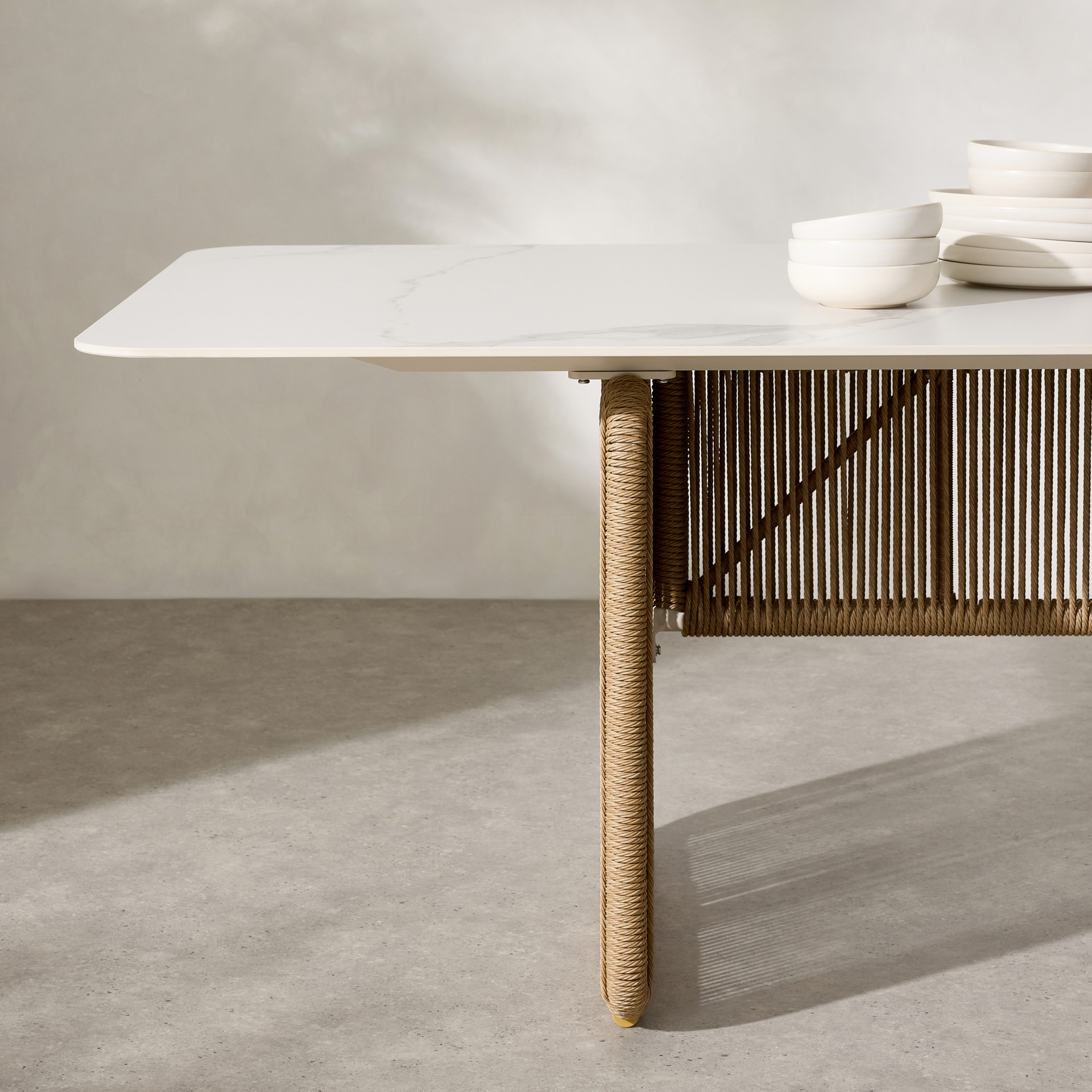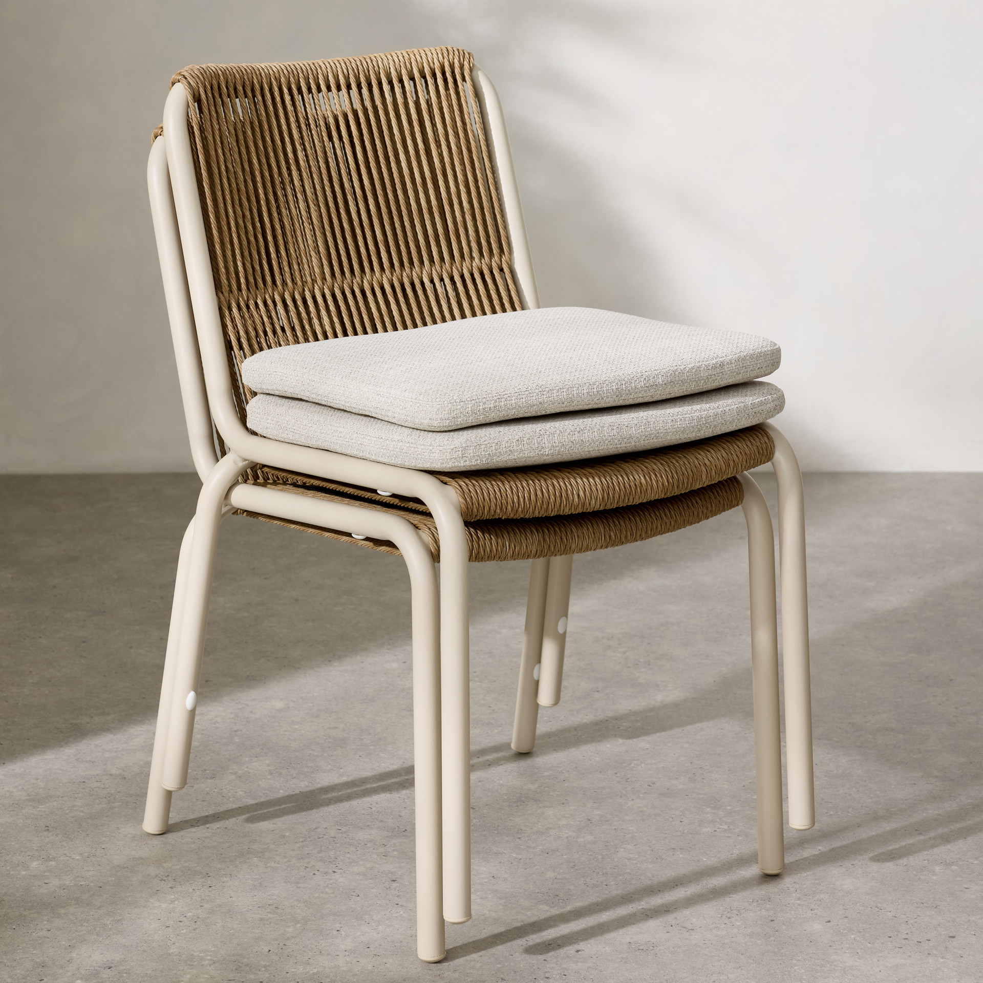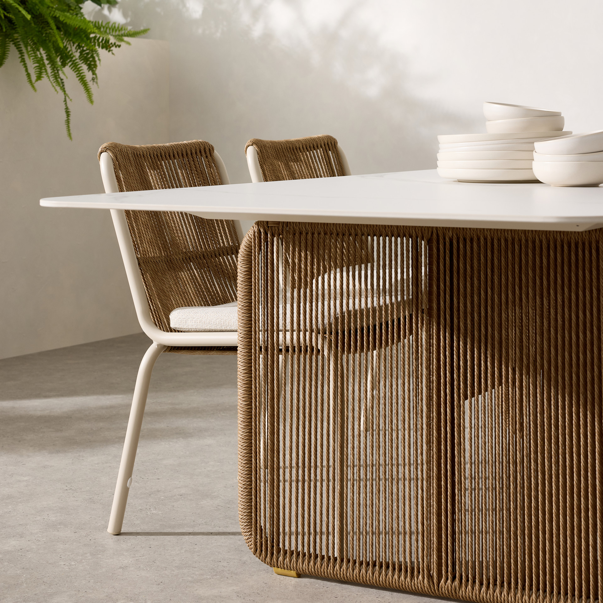 Cette chaise de salle à manger est dotée d'un tissage en osier torsadé, tandis que les cadres en aluminium avec revêtement en poudre et les coussins exposés assurent un confort stable.