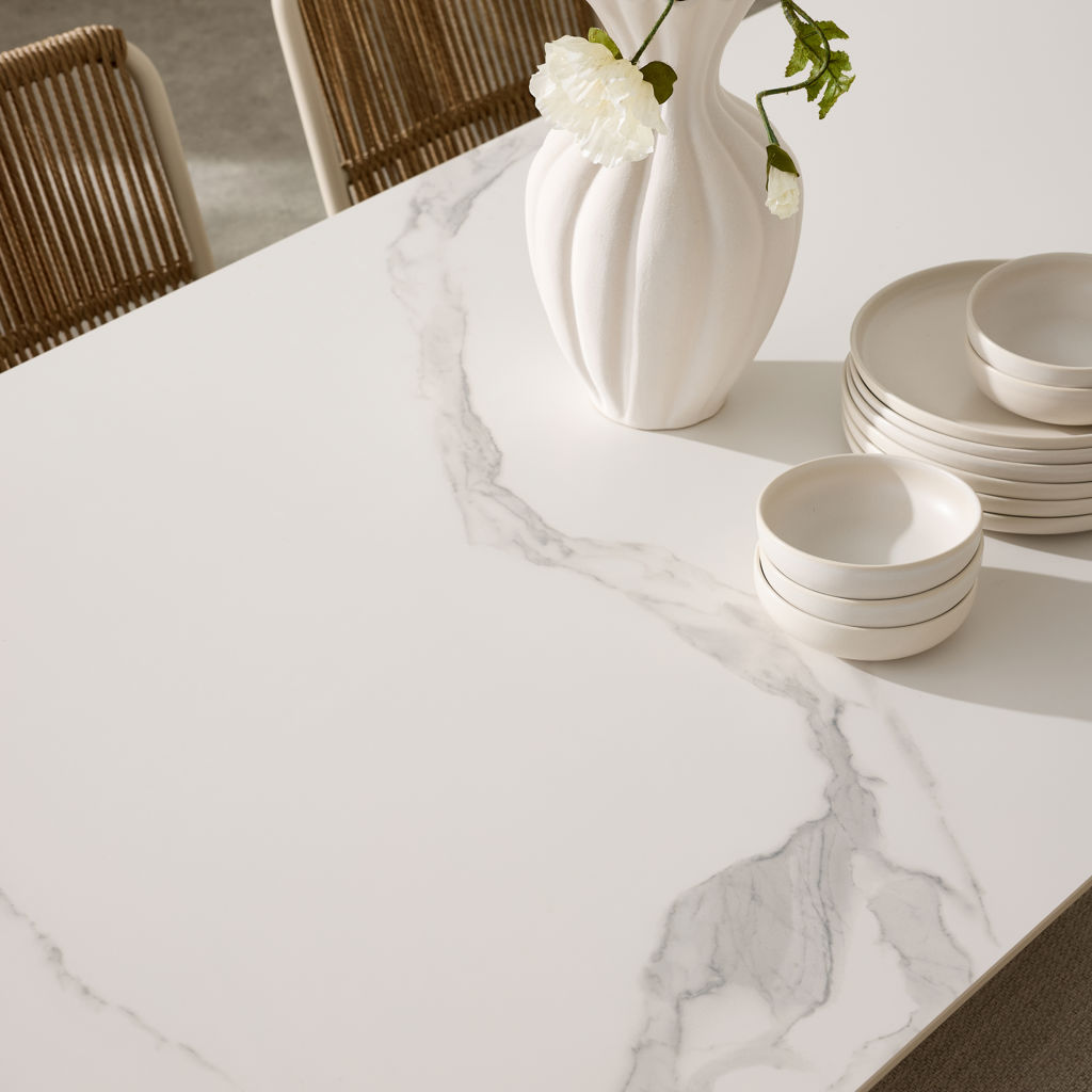 Avec son dessus en marbre, sa structure en aluminium et son recouvrement en textilène vous saurez impressionner vos invités.