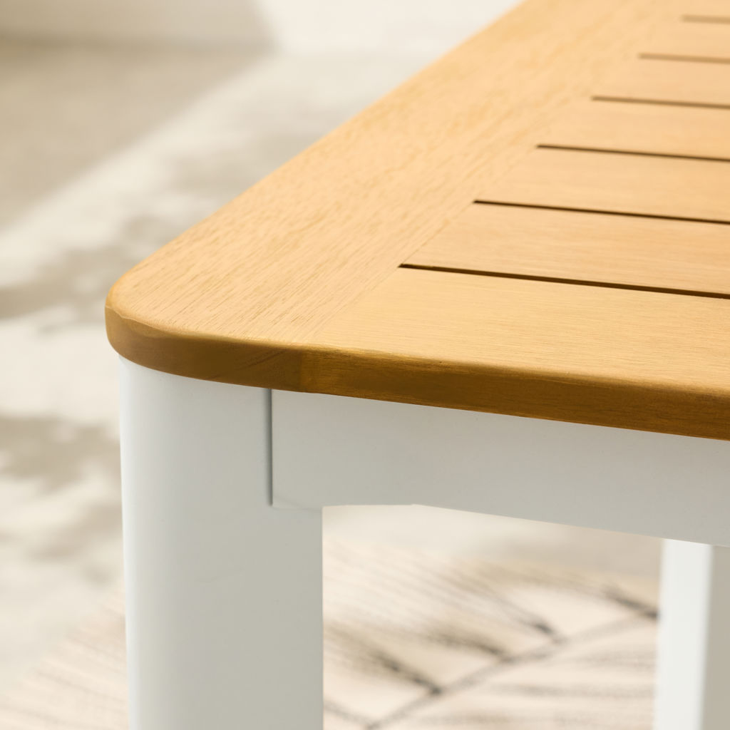 Le plateau de la table en bois d'eucalyptus est parfait pour poser des boissons ou des objets décoratifs, rehaussant l'esthétique générale. L'ensemble est conçu pour allier confort et style, créant une atmosphère chaleureuse et accueillante.