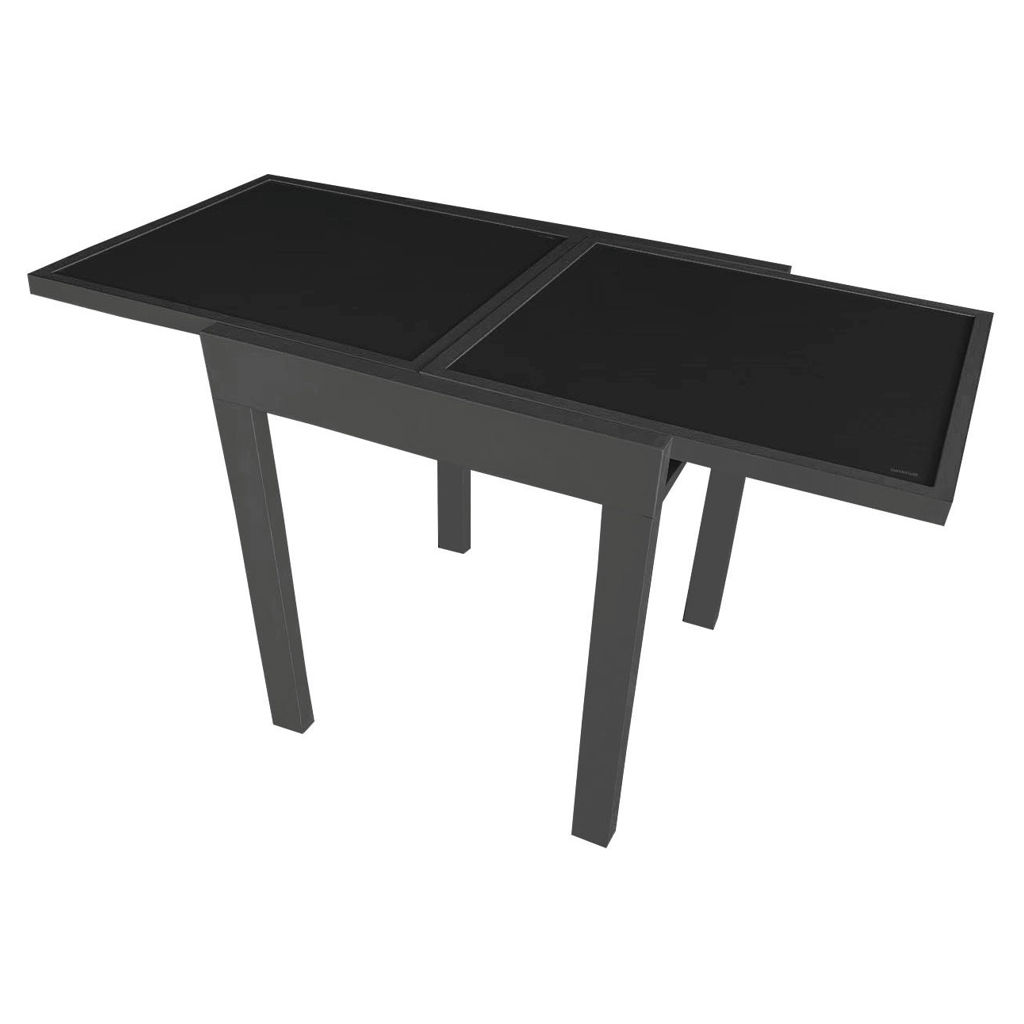 Sa structure en aluminium avec revêtement en poudre assure solidité, légèreté et résistance aux intempéries, tandis que la surface en verre trempé noir apporte une touche contemporaine et élégante à votre espace.