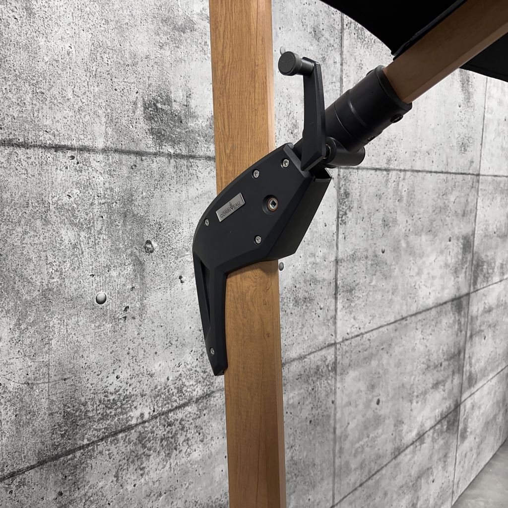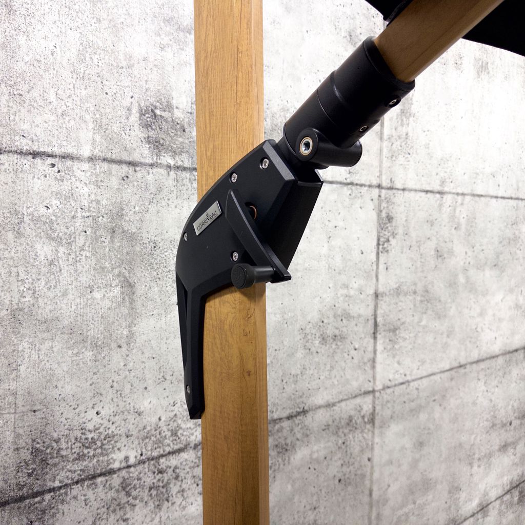 • En plus d'avoir un mécanisme de rotation à la base du pôle, ce parasol permet 6 différentes inclinaisons ainsi qu'un pivotement horizontal vous protégeant ainsi peu importe la position du soleil.