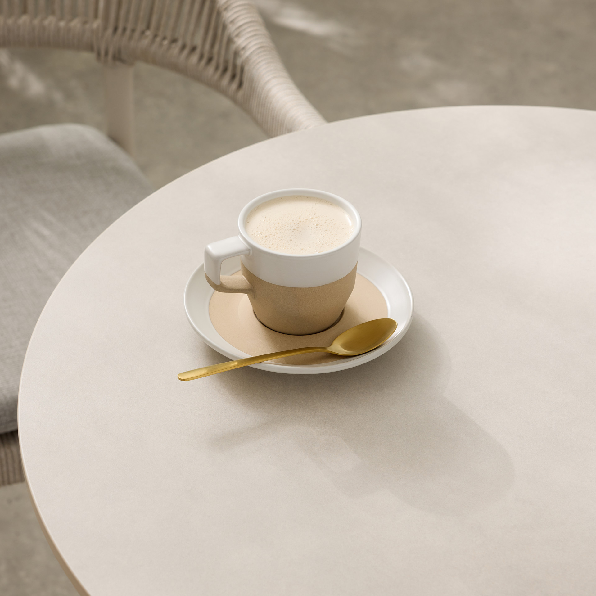 Cette table bistro est chic et élégante avec sa surface en <pierre sintérisée> à fini marbré.