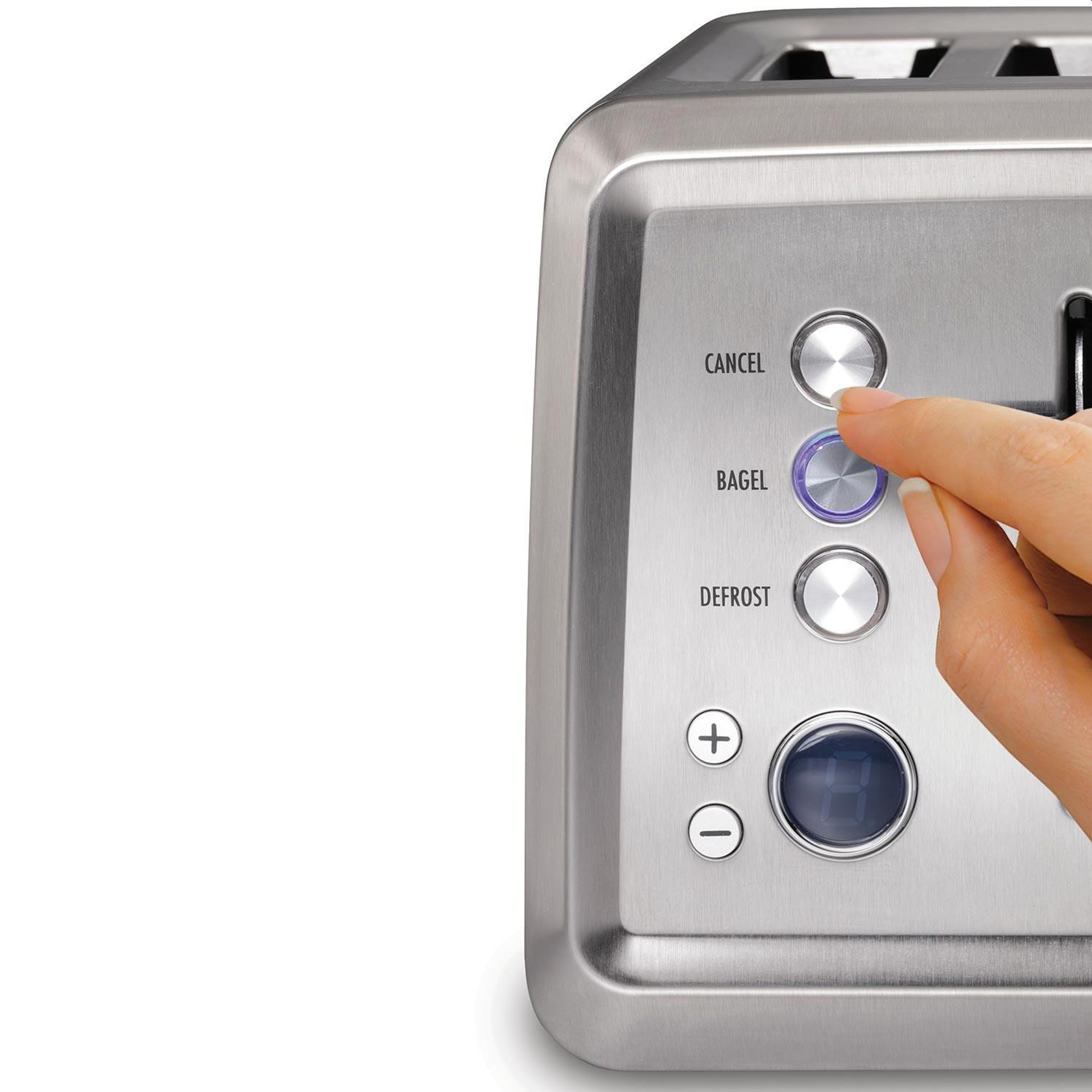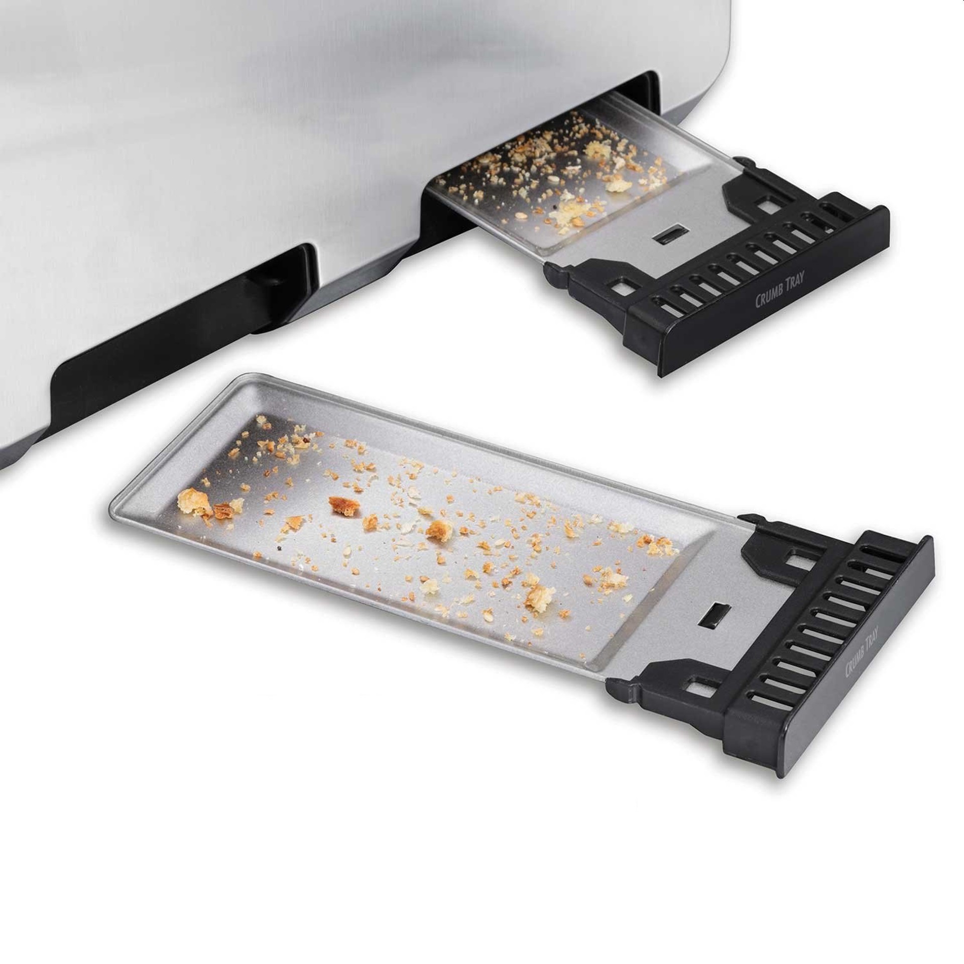 La conception moderne en acier inoxydable comprend un affichage numérique qui montre la teinte sélectionnée en un coup d'œil, et les boutons faciles à enfoncer sont mis en évidence par des voyants lumineux. Les ramasse-miettes coulissants facilitent le nettoyage.