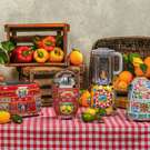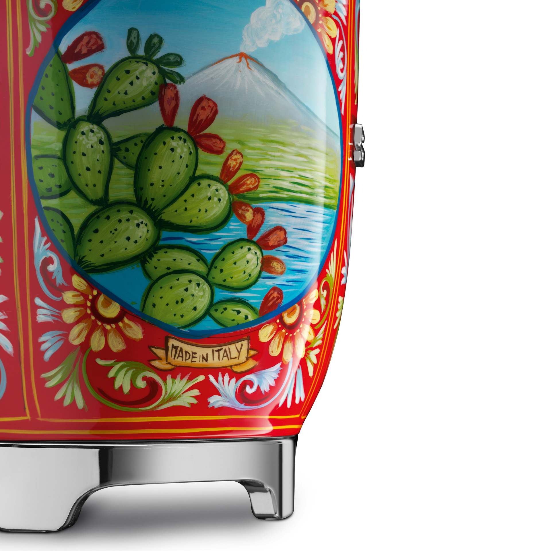 Grille-pain, presse-agrumes, machines à café, bouilloire, mixeur, batteur sur socle et centrifugeuse lente, tous décorés de citrons dorés, d'agrumes, de figues de Barbarie et de cerises rouge vif ne sont que quelques-unes des décorations siciliennes typiques encadrées de motifs triangulaires.