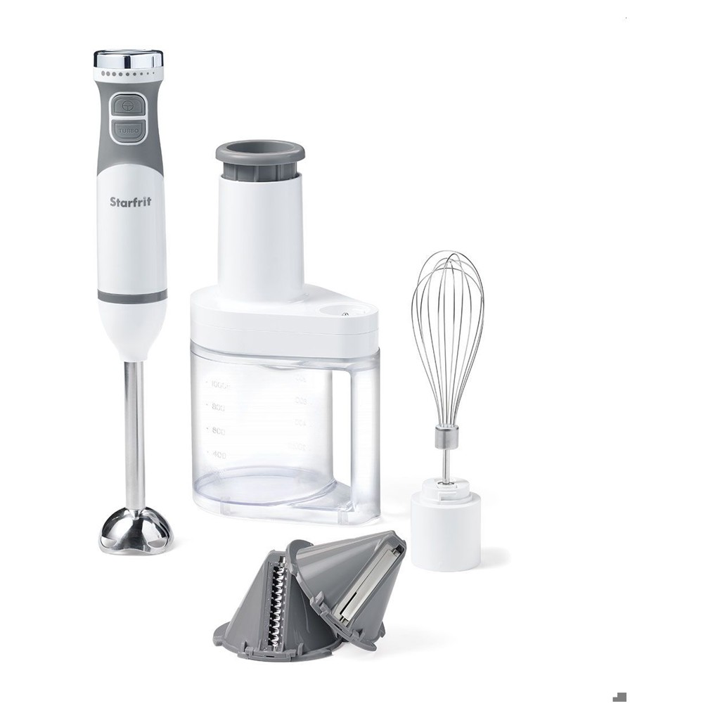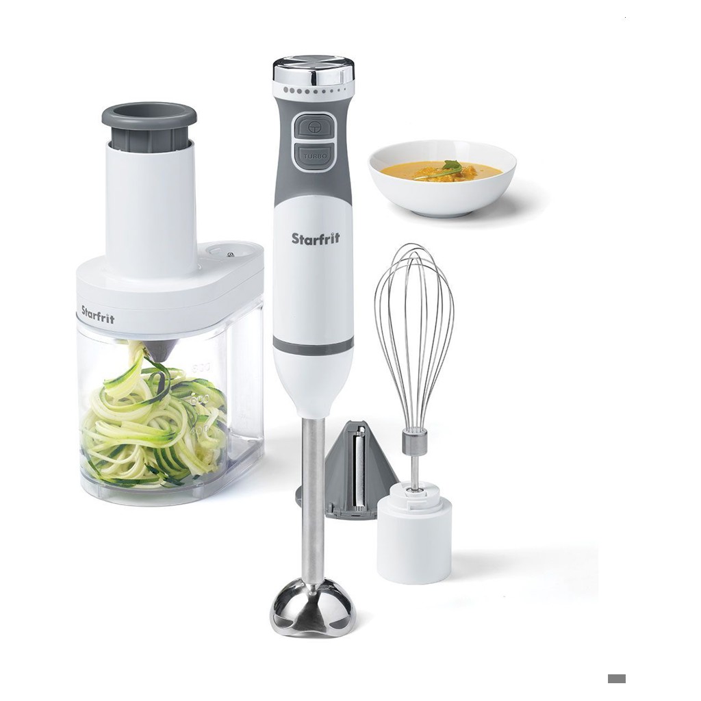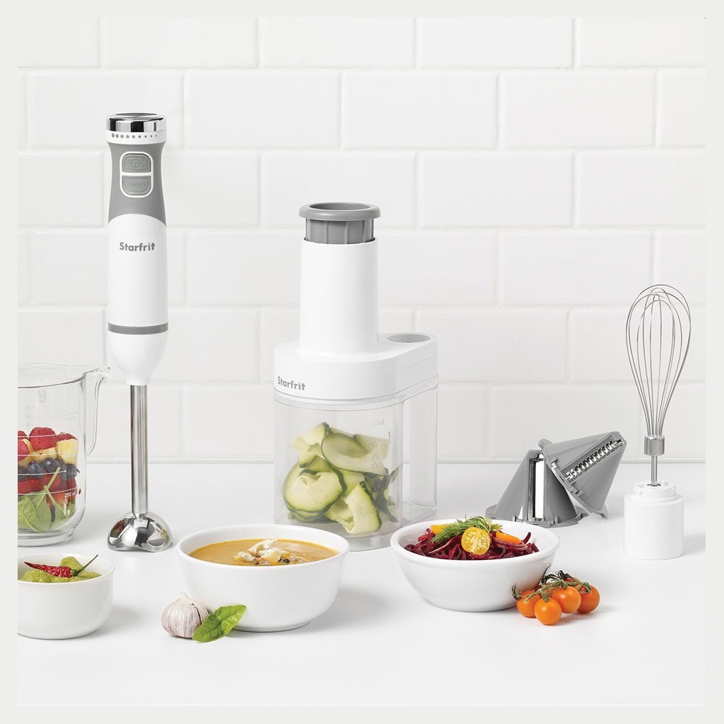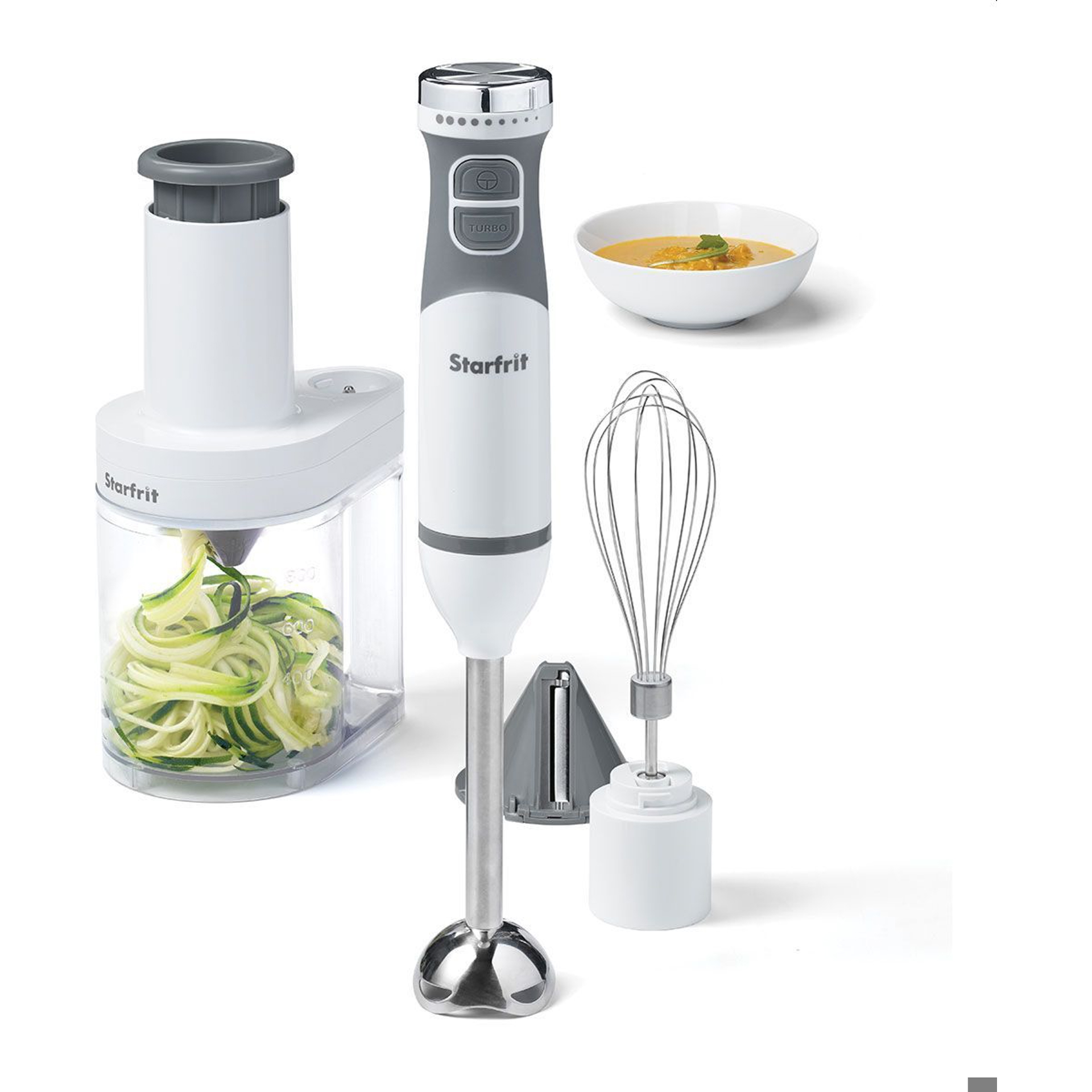 STARFRIT 4EN1 MÉLANGEUR À MAIN Mélangeur à main 4EN1, mélanger, spiraliser,fouetter 10 contrôles de vitesse variable pour une puissance maximale Poignée ergonomique avec prise souple 2 lames à spirale interchangeables (fine et trancher) Fouet en acier inoxydable Contenant gradué de 1L pour collecter les aliments,mesurer et mélanger (ml,oz,tasses) Pièces détachables pour nettoyage pratique, 250W