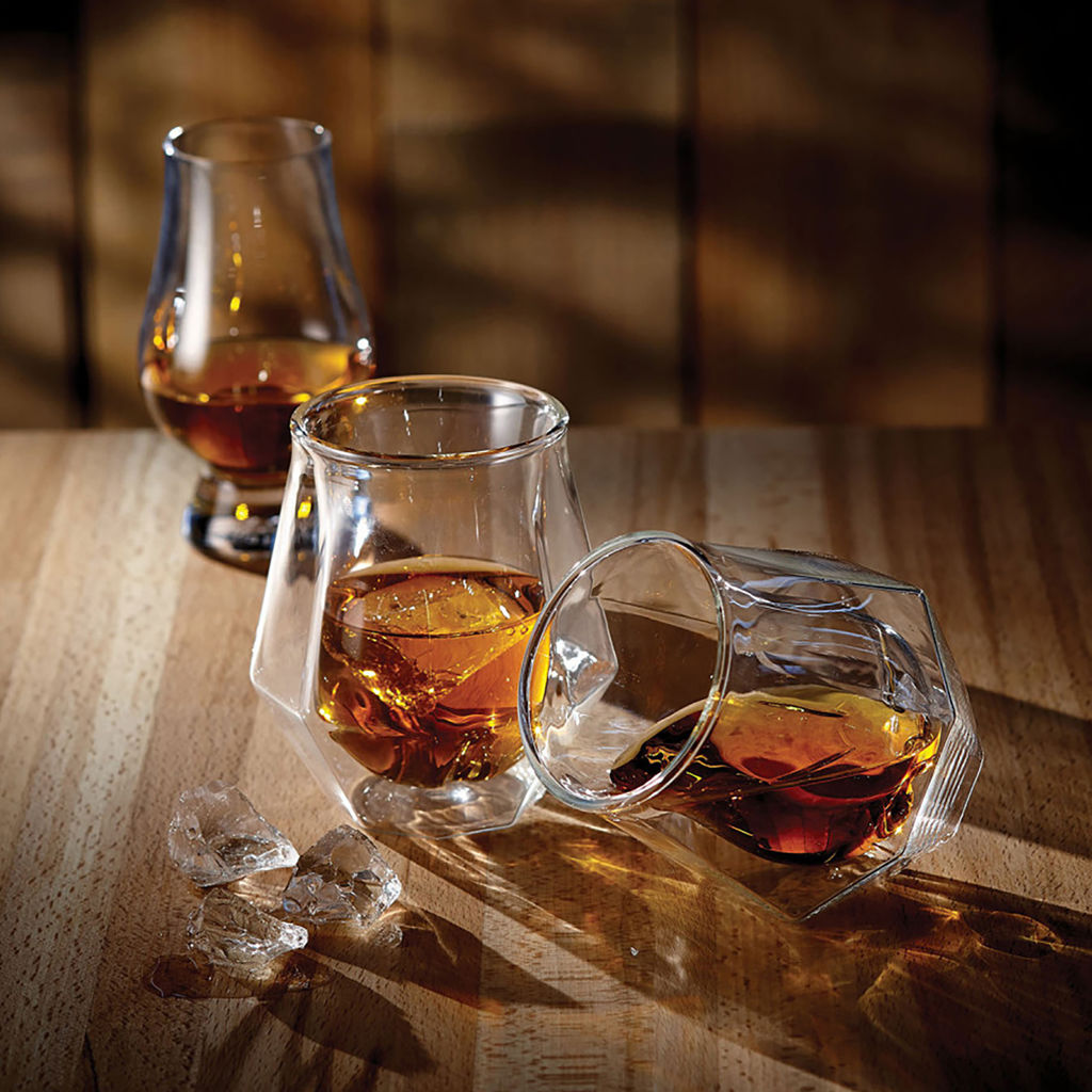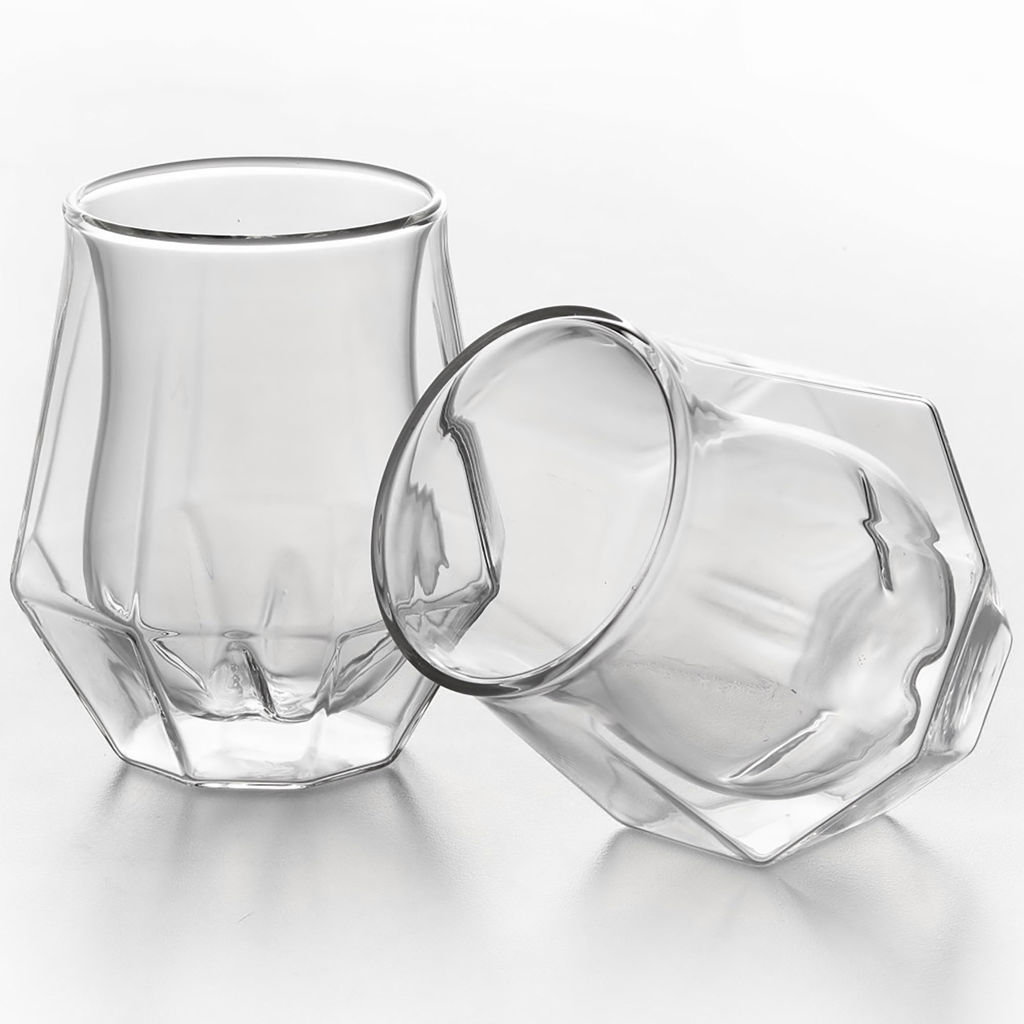 Cet ensemble de 2 verres à whisky Diamond de Double Double divertira vos invités. La double paroi en verre borosilicate soufflé à la bouche donne une illusion d'optique et sert d'isolation aux boissons chaudes ou froides.