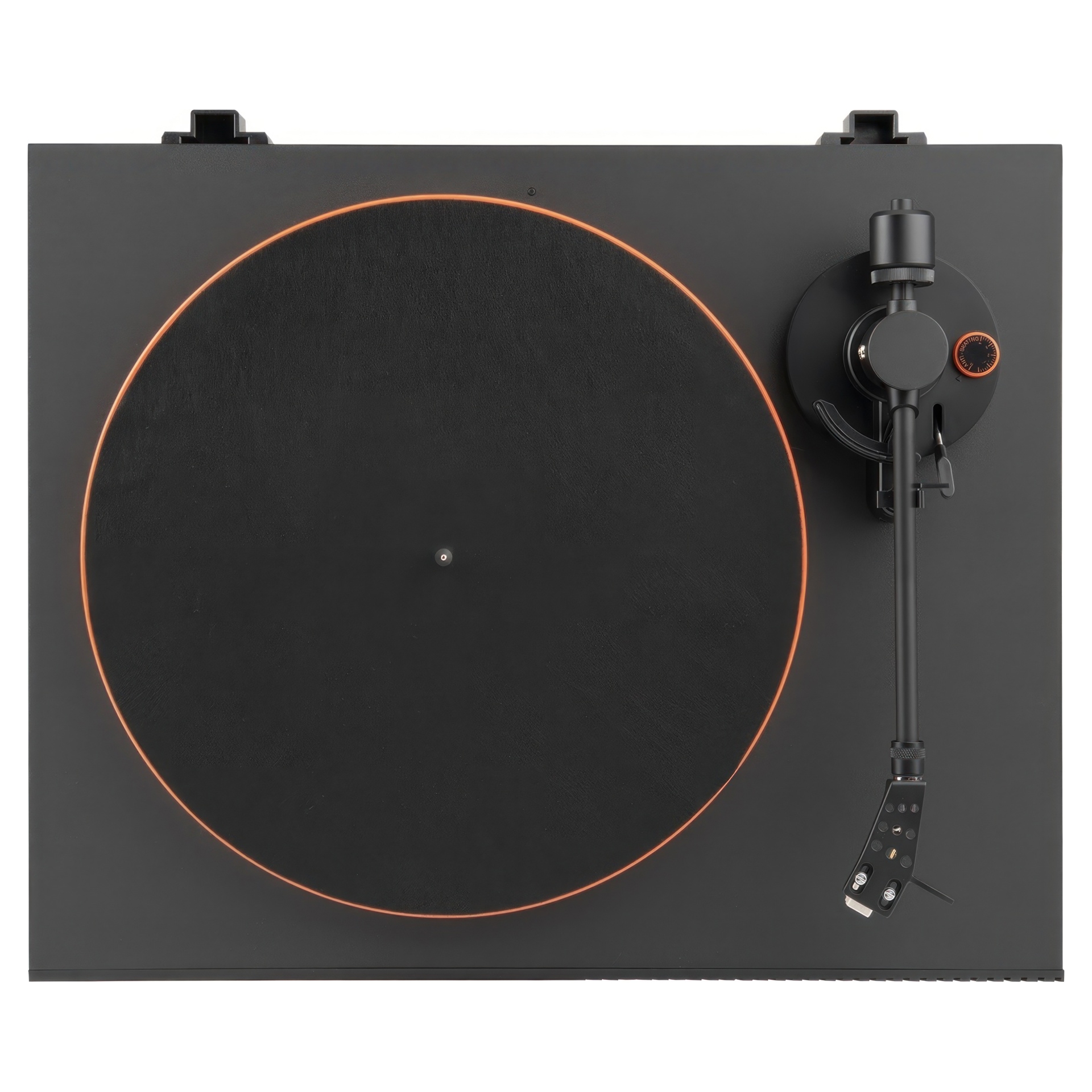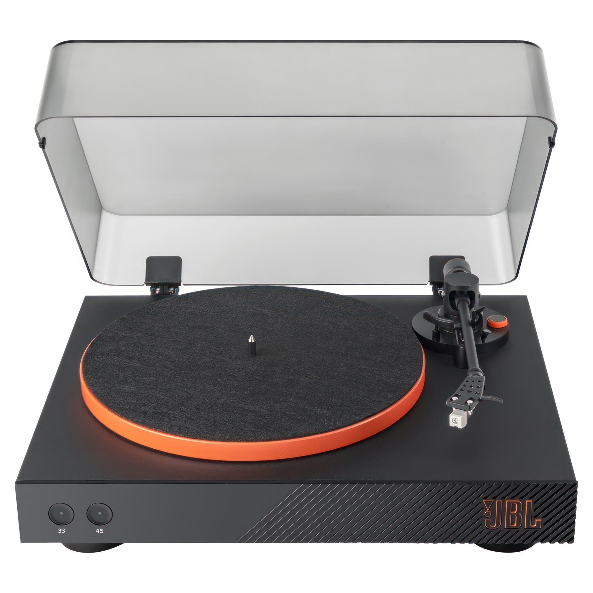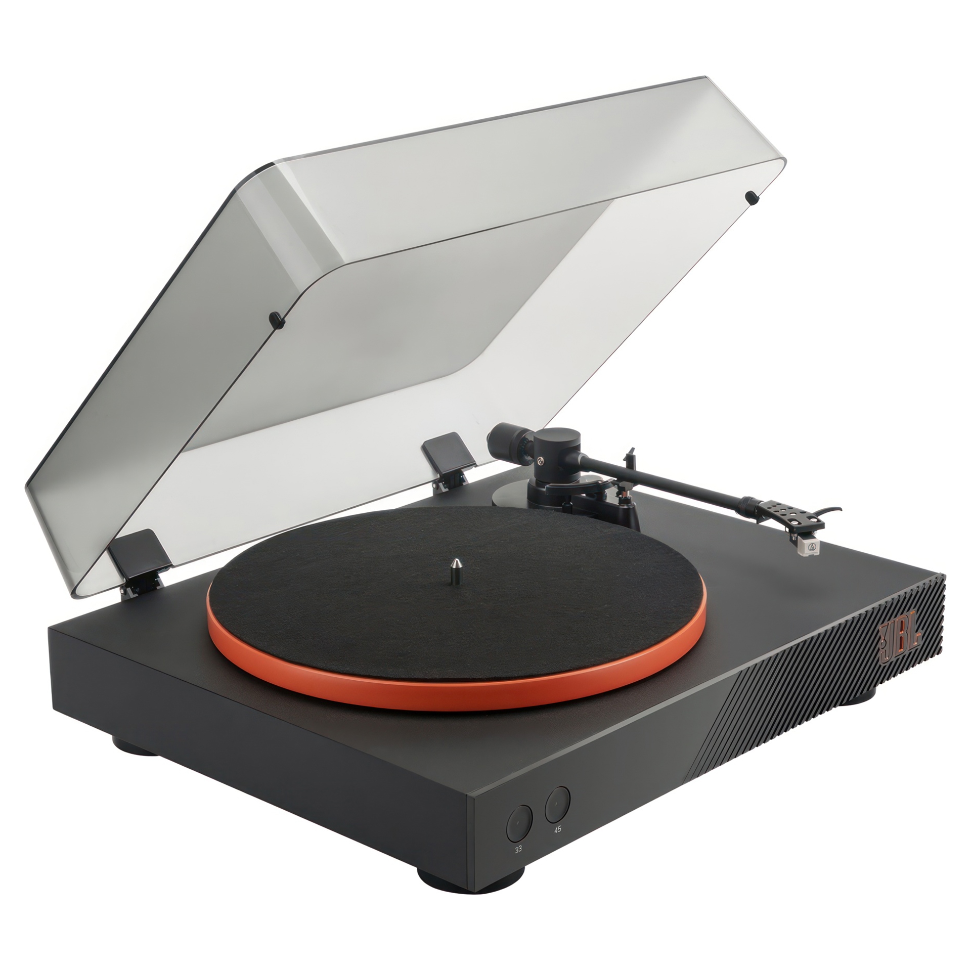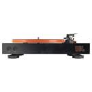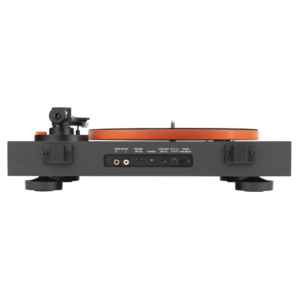 Le plateau en aluminium est muni d'un entraînement par courroie et un moteur avec un capteur optique en dessous pour garantir que vos disques soient parfaitement lus à temps à 33,3 tr/min pour les albums, ou à 45 tr/min pour les EP et les singles.