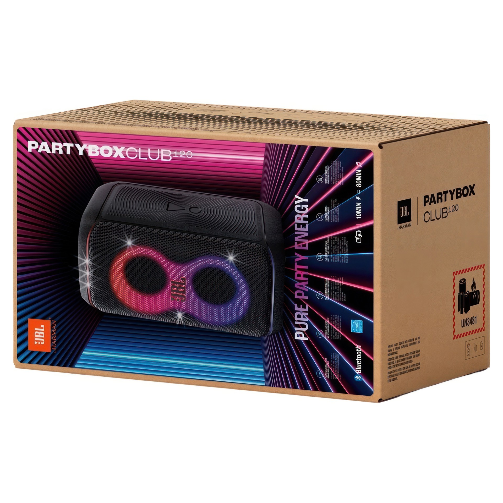 Grâce à la JBL PartyBox Club 120, n’importe quel espace devient un lieu de fête et d’ambiance. Le puissant son JBL Pro remplit l’air tandis qu’un spectacle lumineux enchanteur de lumières étoilées, de traînées lumineuses et d’effets stroboscopiques se synchronise à votre rythme.