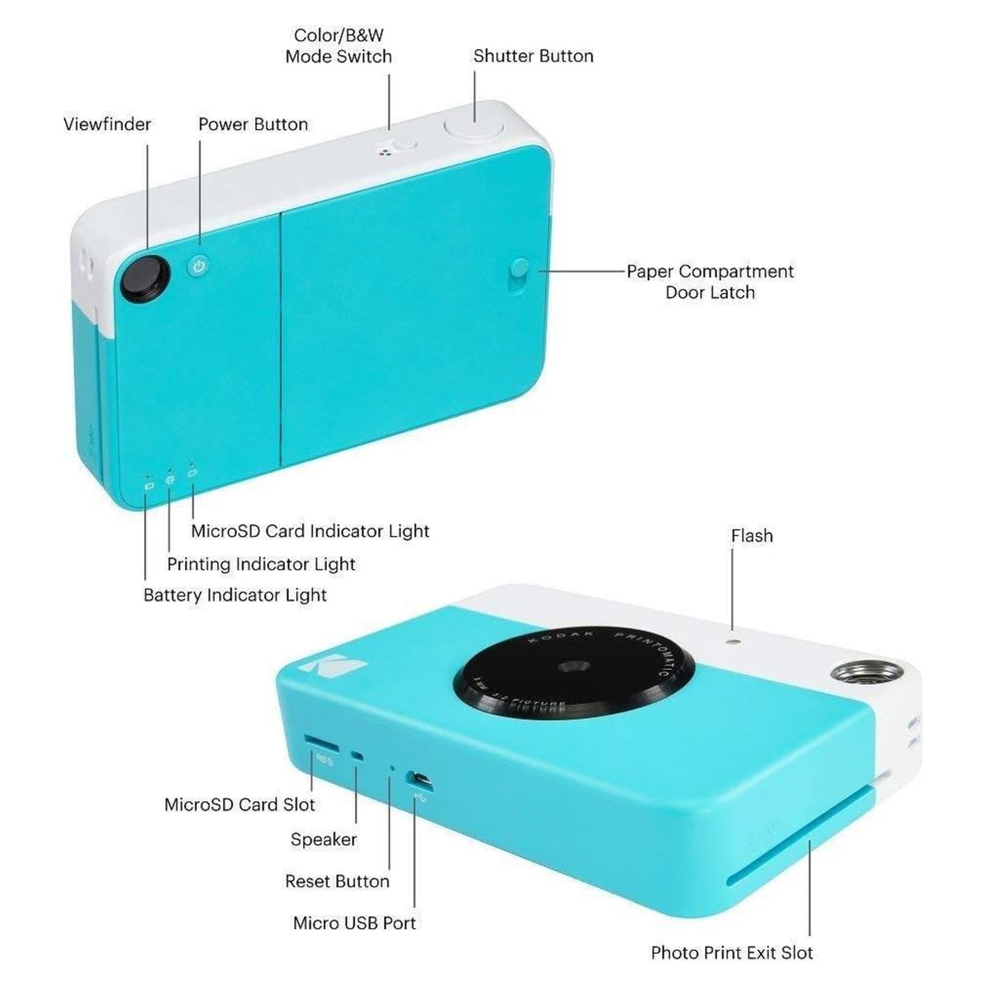 Le mini appareil photo instantané Kodak Printomatic imprime automatiquement des photos jusqu'à 5 MP, résistantes aux taches, à l'eau et aux déchirures.