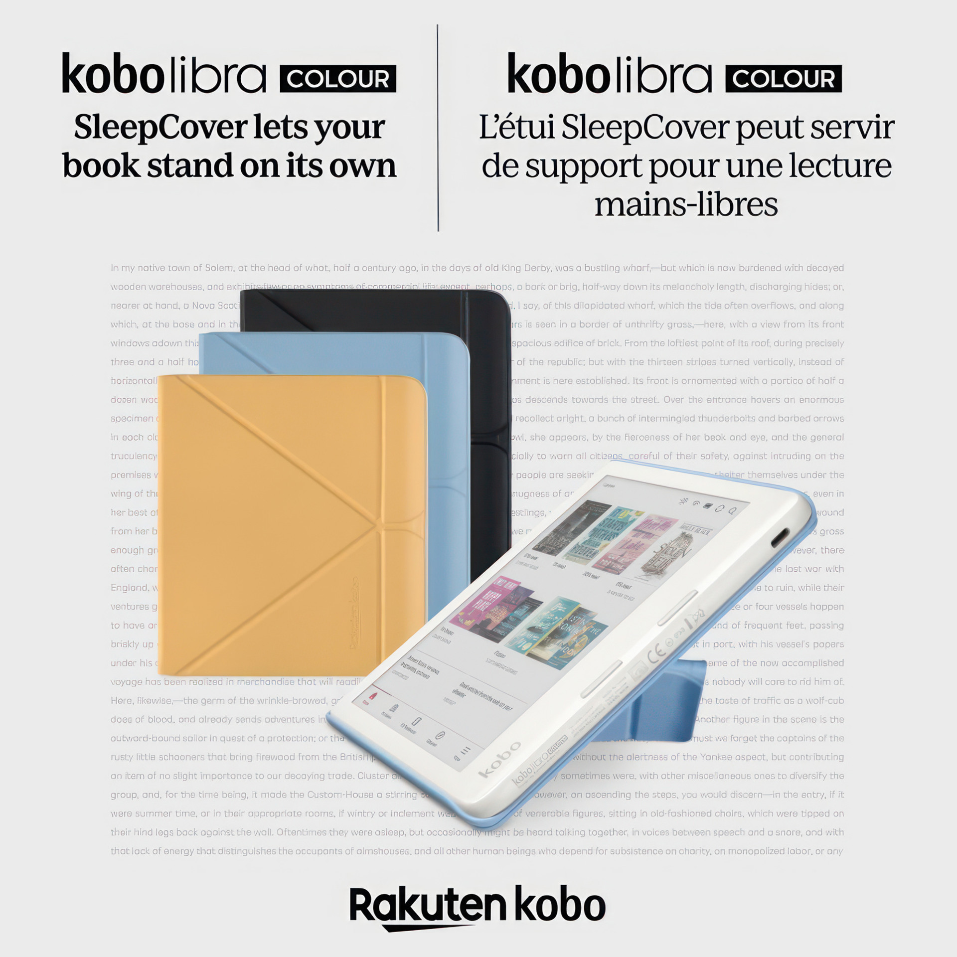 Disponible en bleu crépuscule, jaune beurre et noir. La Kobo Libra Colour SleepCover est uniquement compatible avec la Kobo Libra Colour.