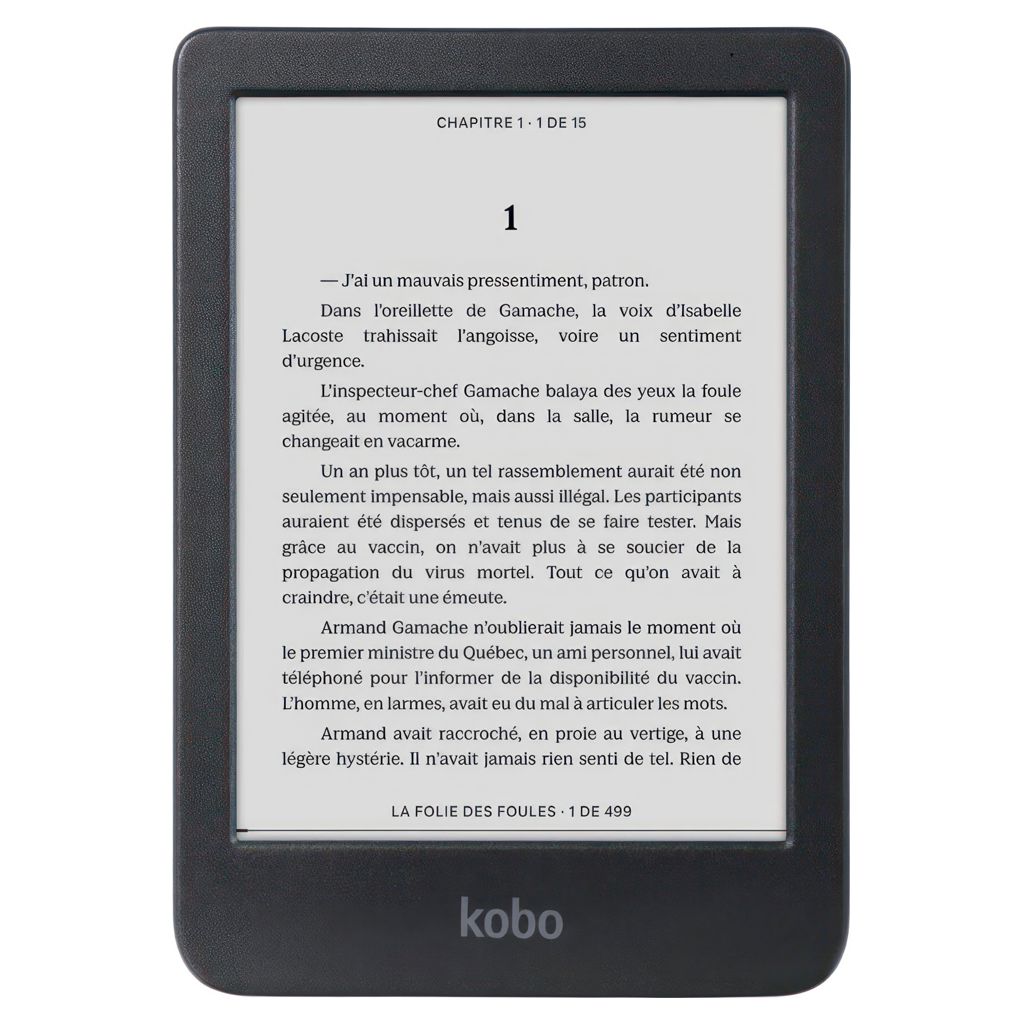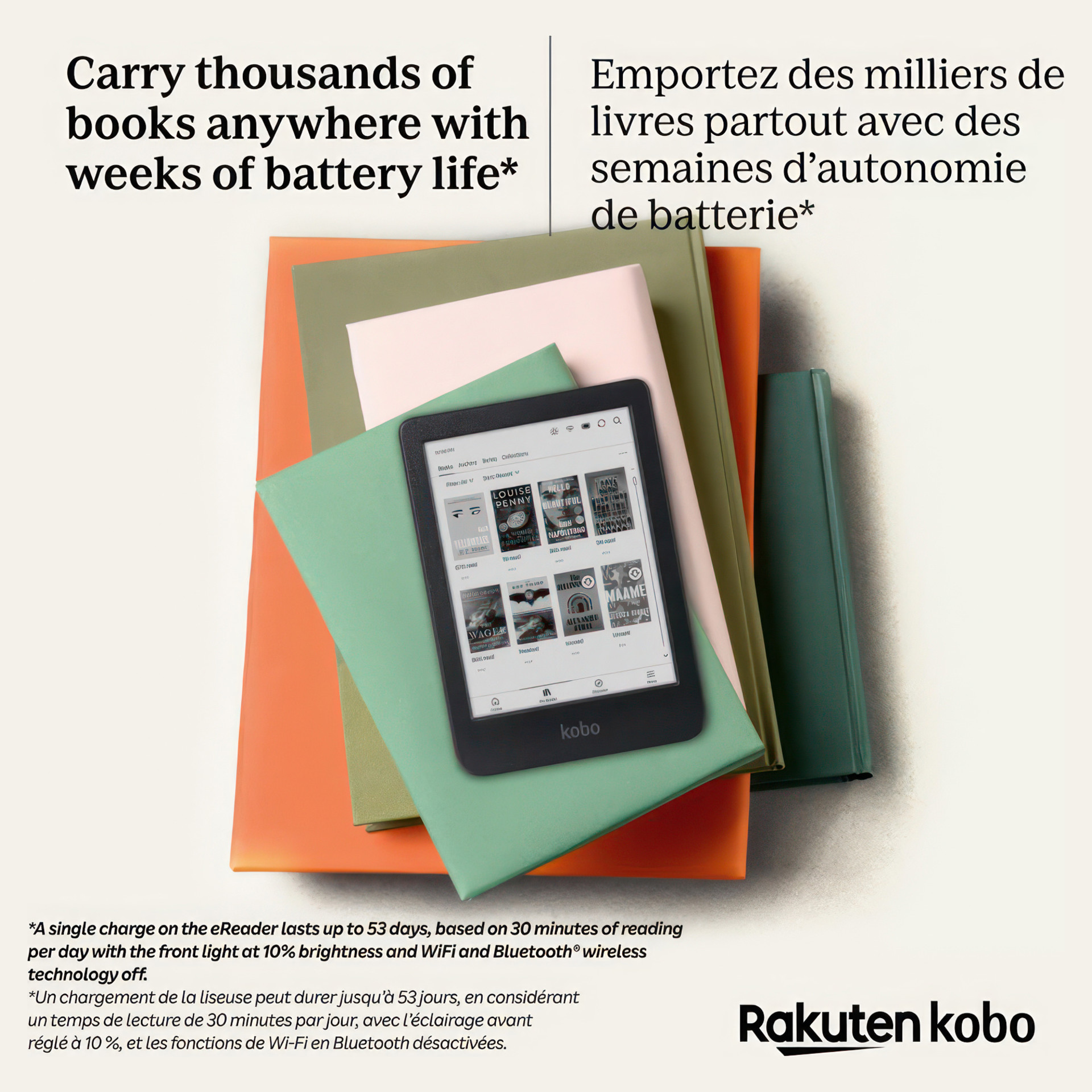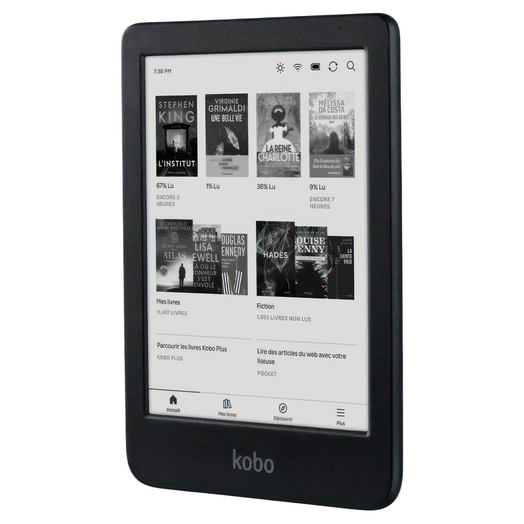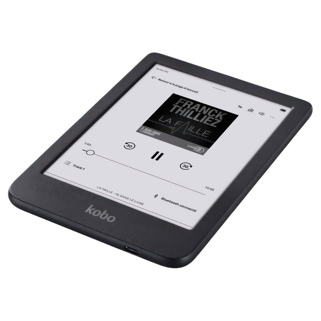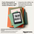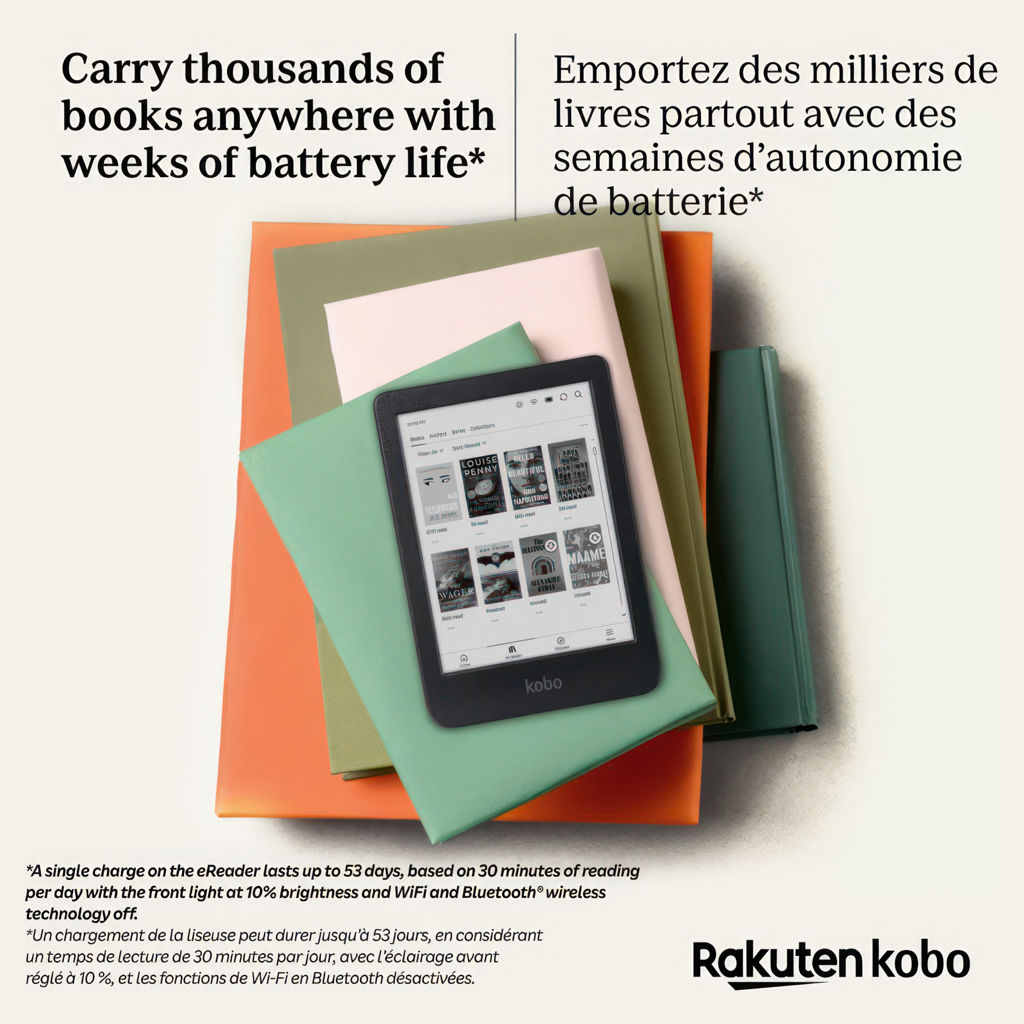 Un chargement de la liseuse peut durer jusqu’à 53 jours, en considérant un temps de lecture de 30 minutes par jour, avec l’éclairage avant réglé à 10 %, et les fonctions de Wi-Fi en Bluetooth® désactivées.